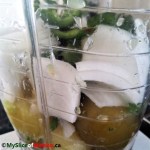 For the raw sauce, first I peeled the husks from the tomatillos, washed and scrubbed them to remove the sticky layer on their skin.  The rest of the veggies were washed and cleaned, peeled and sliced coarsely, as shown in the picture, above.  Everything went in the blender (juice only, from lime), starting with pulses, then I switched to blending to incorporate all the ingredients, for about one minute.