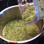 The drained tomatillos went in the blender, along with onion, cilantro, and peppers.  I started pulsing until all ingredients were incorporated, and then switched to blending until I got a uniform appearance.  I poured the sauce back into the empty pot, added salt and brought it to boil over medium heat.