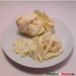 One of the traditional Mexican cheeses for quesadillas is quesillo de Oaxaca (Oaxacan little cheese) which is very similar to the mozzarella cheese balls that can be unraveled like yarn (see photos); I prepared this cheese by doing so, cutting the strings about 2 inches long, and setting aside on a plate. I like thick sour cream and my husband does not like it at all, so I serve it as an optional topping, always choosing a brand with no starch in their ingredient list.