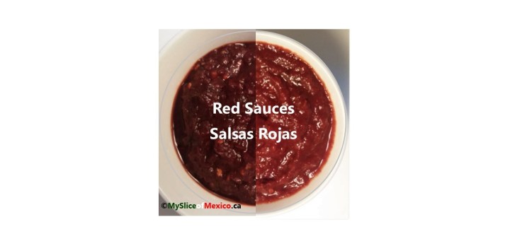 I removed the stem end from the tomato, cut it in quarters and put it in the blender with the onions, then processed until it became a smooth paste. By gradually adding some charred tomato paste to the reserved Guajillo paste, and tasting, I could reach just the right level of spiciness. In the photo below, the spicy sauce (without tomato) on the left, has a nice contrast next to the milder (with tomato and onion) on the right, both in terms of colour, and flavour. These sauces are great with tacos, or on the side with roasts, such as my Puebla style pork roast.