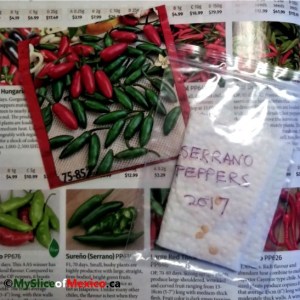 From left to right – tomatillo seed: purple, and Toma Verde packets, on the 2018 Vesey’s catalogue showing Tomayo; serrano seed: packet from McKenzie’s, and saved seed from my 2017 crop, on the 2018 West Coast catalogue showing Sureño variety; coriander seed (cilantro): saved seed from my 2016 crop, on the 2018 Vesey’s catalogue showing Calypso variety.