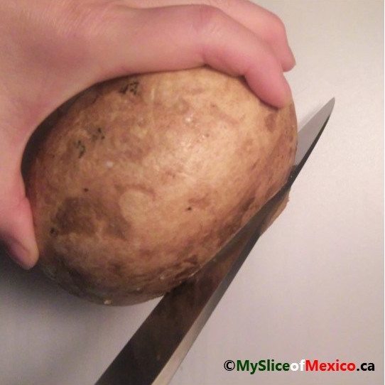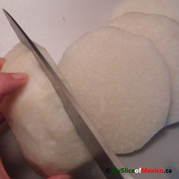 I removed a couple of blemishes with the knife, as well. Now I have a nice round and white root. Turning the jicama on its side again, I started by slicing discs.