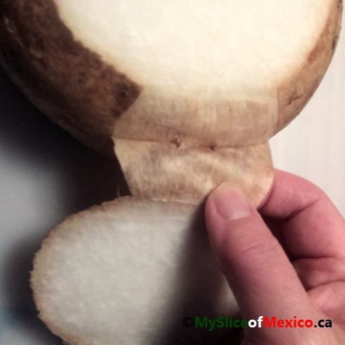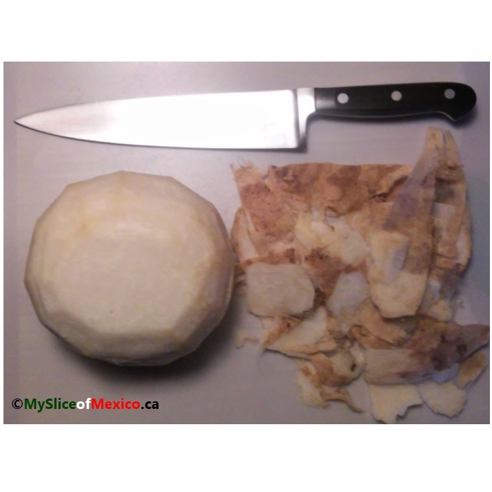 In an older post, I casually mentioned jicama, but did not explained what it is. The reason was that it would have taken the attention away from the main subject (pico de gallo, the fruit salad), but also because I did not find any at the store back then. For the last couple of weeks, I have seen them at the supermarket, so I finally got around to buy one and now I can talk about it in more detail. The word jicama comes from the Nahuatl xīcamatl – watery root, which is a very accurate description. On the outside, it looks like an overgrown turnip (see photo), but inside, it is white and very juicy. The best way to enjoy it is raw, although it works great in stir-fries, for example, taking the place of water chestnuts.