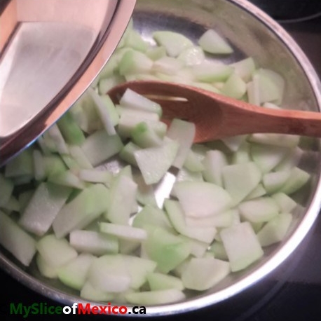 Some people leave the skin on, which is probably very nutritious, but I do not care for it, and again, some people remove the seed (beige oval in the middle), but I have to say that growing up, the seed was my favourite part, and I would always ask the rest of the family to donate theirs to my plate. So for me, skin is off, seed stays in, but it is optional to do the opposite, or any combination.  The sliced chayotes were sautéed with just a hint of olive oil over medium heat for about 5 minutes, then covered and simmered for another 10 minutes at low heat: