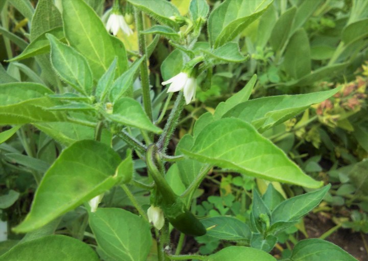 Back in March, I had mentioned that I would be following up on three crops that are very helpful in the Mexican kitchen.  The first two are serrano peppers and tomatillos, which are sometimes hard to find at the store.  The serranos are blooming and growing fruit (close-up at the top of the post); pepper blossoms are so pretty!  And each will grow a fiery and tasty pepper.  There were a few holes on some of the leaves, probably from bug damage; spraying them with a solution of 1 tbsp Epsom salt dissolved in 1 liter of water will help prevent future attacks, and nourish self-repair.  Other than that, they are growing well: