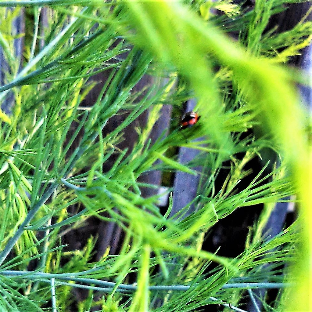 Slug-like bugs on asparagus fronds. Notice the different stages of development. My garden, July 2018