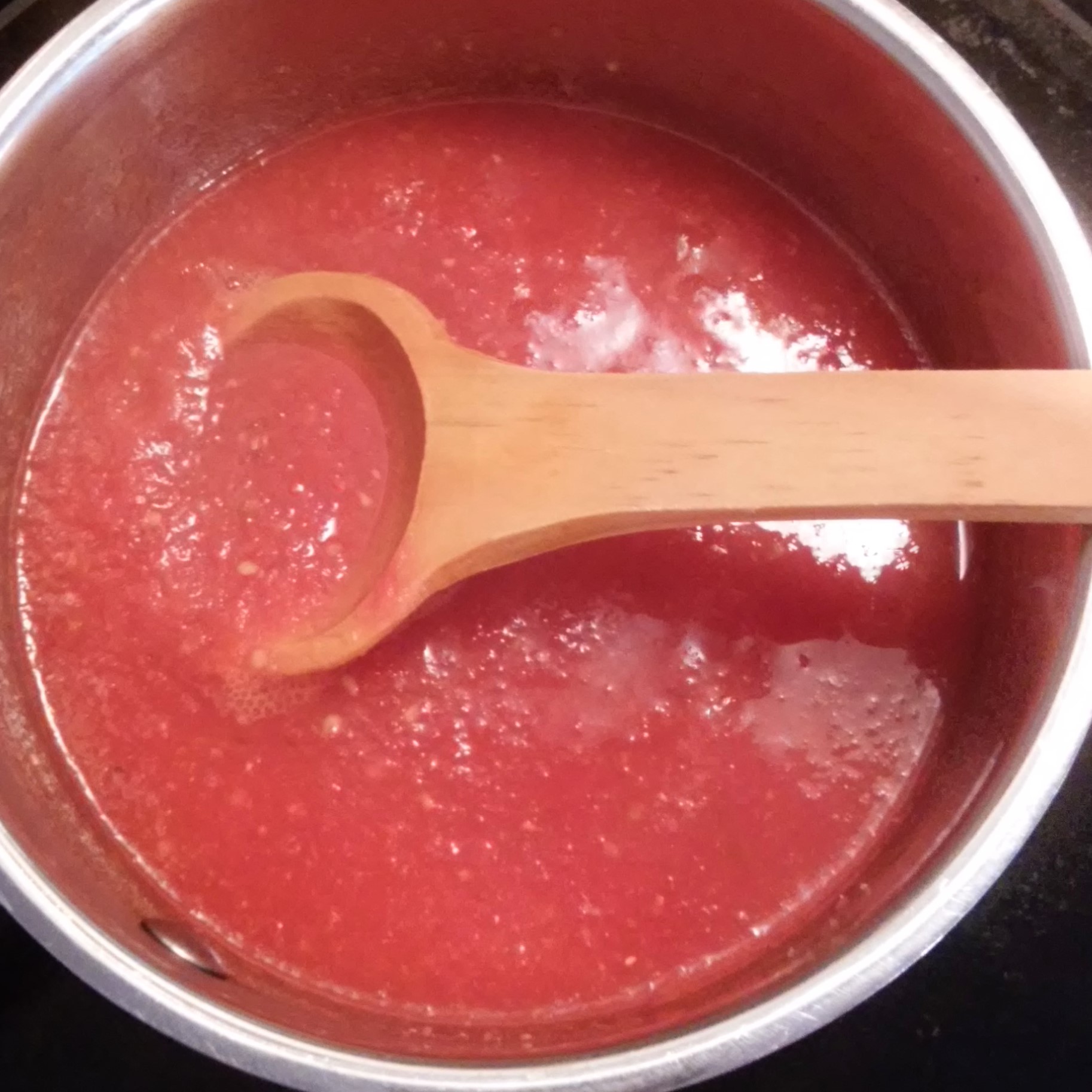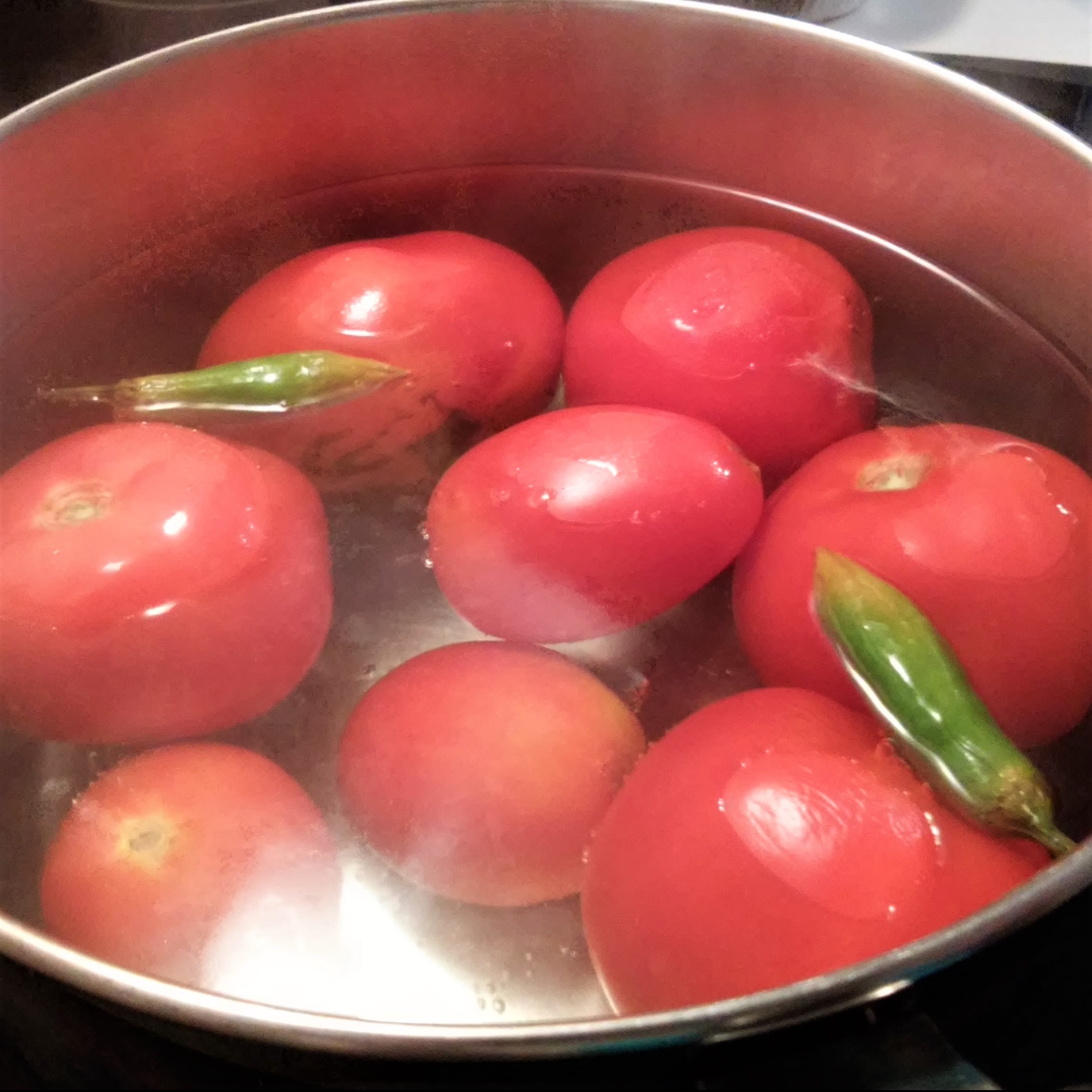 I washed the tomatoes and peppers and cooked them in boiling water for 5 minutes.  After draining the veggies, removing their stems, and peeling the tomatoes, I placed them all in the blender jar along with the onions and garlic, which I had peeled while the veggies were cooking. I processed for two minutes, and poured into a pot, bringing to a boil, then reducing the heat to let it simmer for about 10 minutes. I seasoned the sauce with salt, and kept it simmering: