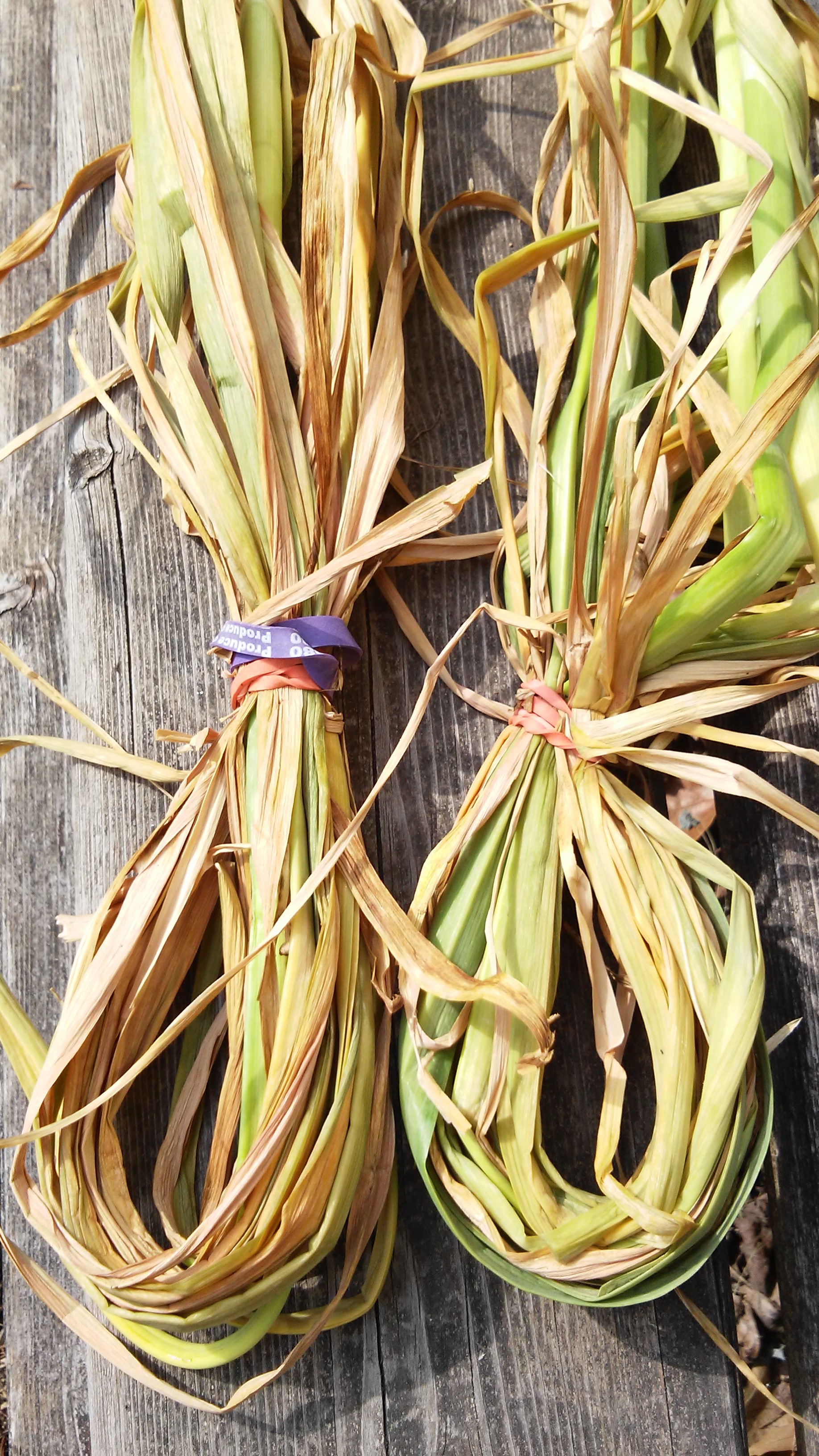 As I was doing this, I formed groups of four or five bulbs by size; in the photo below, notice the exemplary large bulbs bundled in the left, compared to the smaller ones in the bundle of the right. For each bundle, I made a loop with the tops and used rubber bands to keep them together (detail in photo, right):