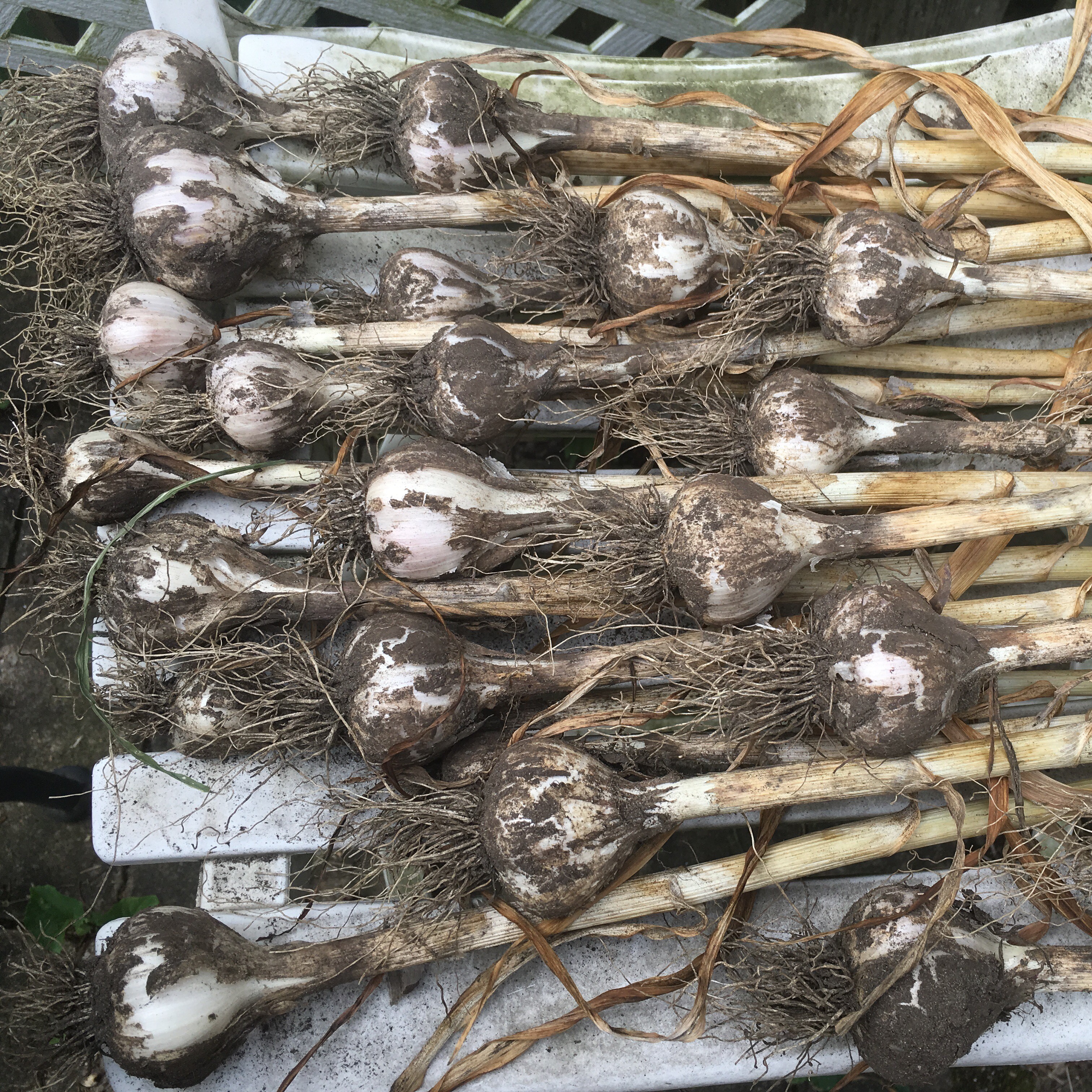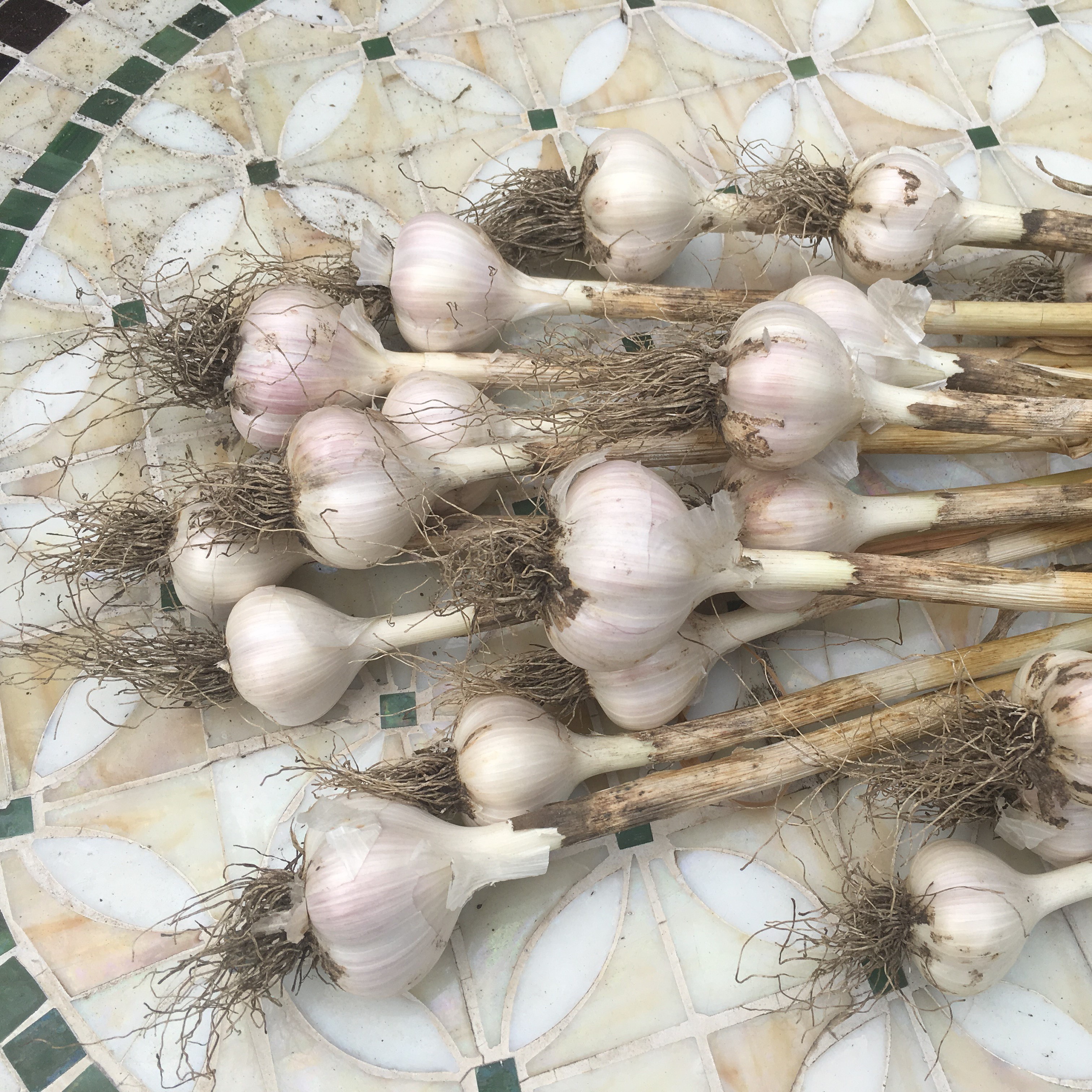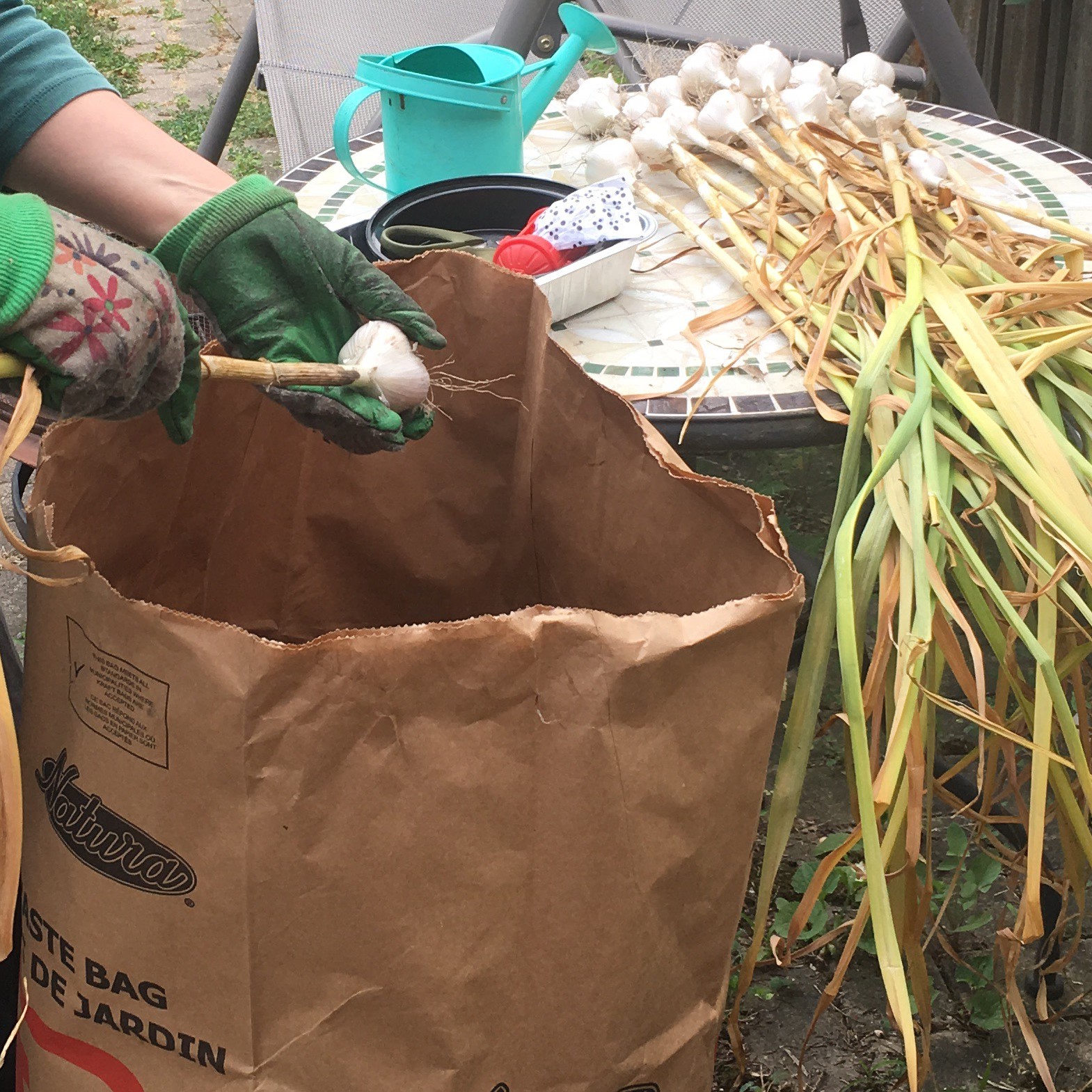 The bulbs must be cured for a few weeks in a dry spot, away from direct sun; I used clothes hangers to hold the bundles by the loop, and hung them in my basement. After curing time, when the tops had completely turned brown, I started cooking with the smallest bulbs, or those with damaged skins. When sowed, each clove will develop into a whole bulb so, in order to keep a sustainable source for planting year after year, it is necessary to save as many cloves as bulbs are expected for harvest. A standard estimate is to save about one quarter of the largest bulbs for the next crop, but in reality, each variety of garlic may have a different average number of cloves per bulb; I guessed that in my case, I roughly needed to save 10 bulbs (4-7 cloves per bulb.)