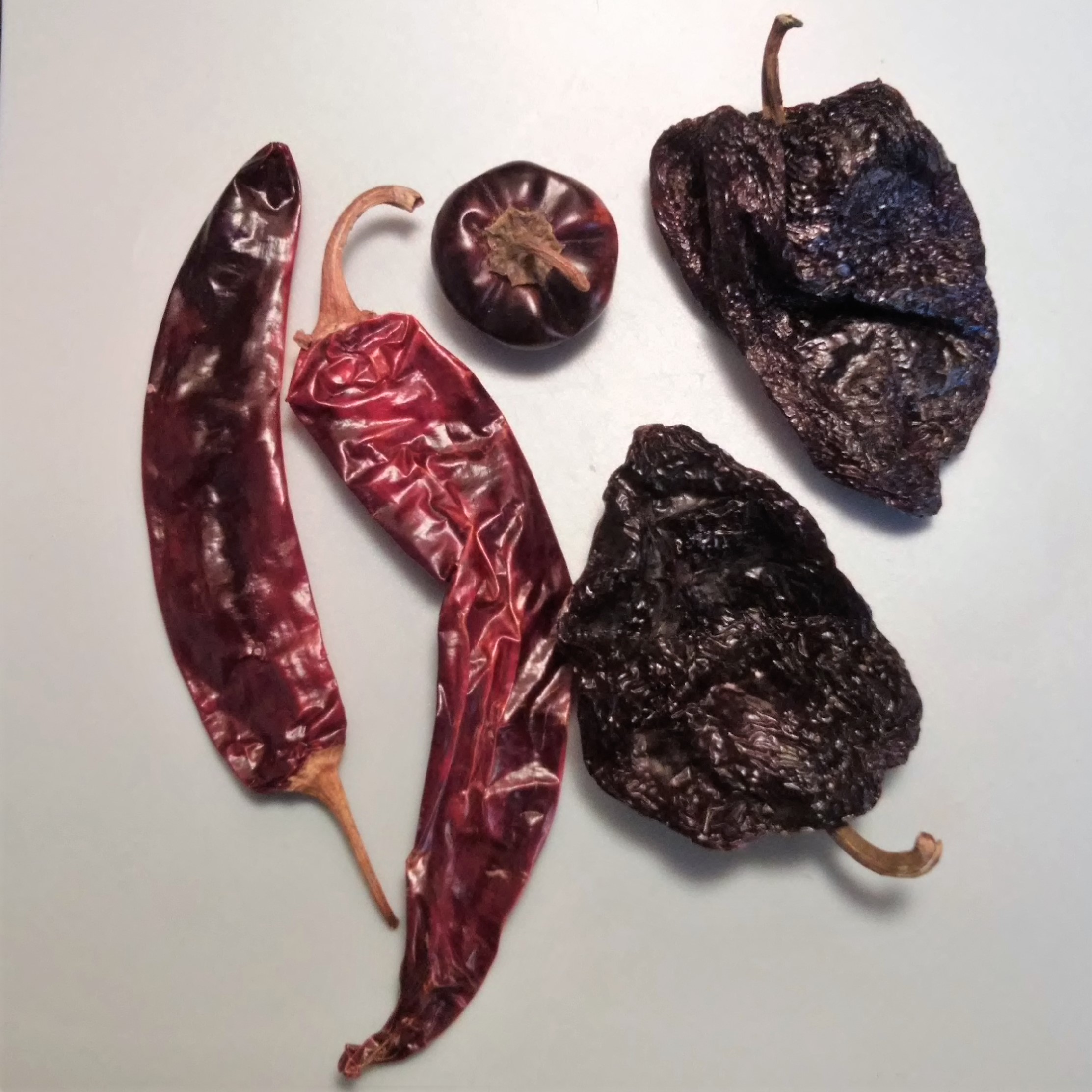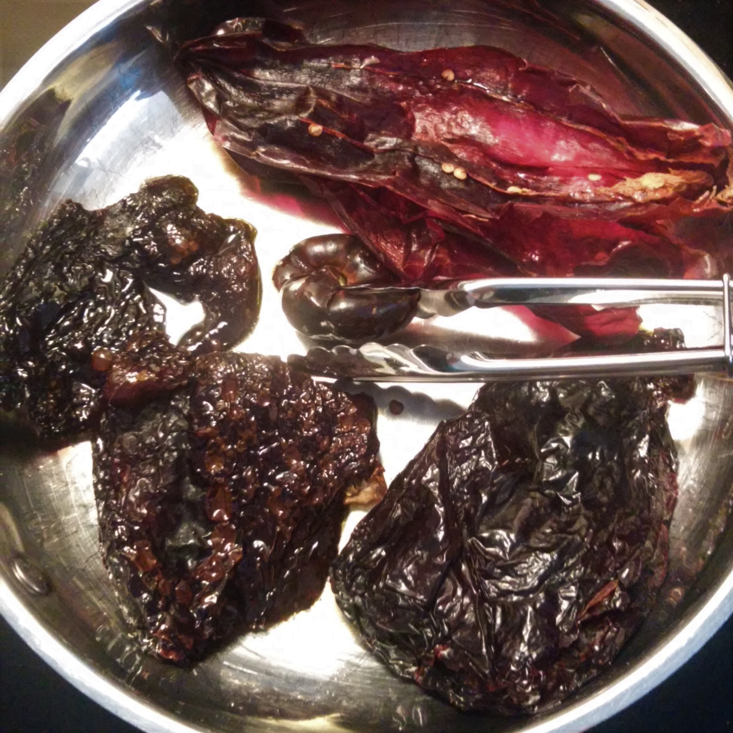 5 dry red peppers (for example, 2 ancho, 2 guajillo, and 1 cascabel)