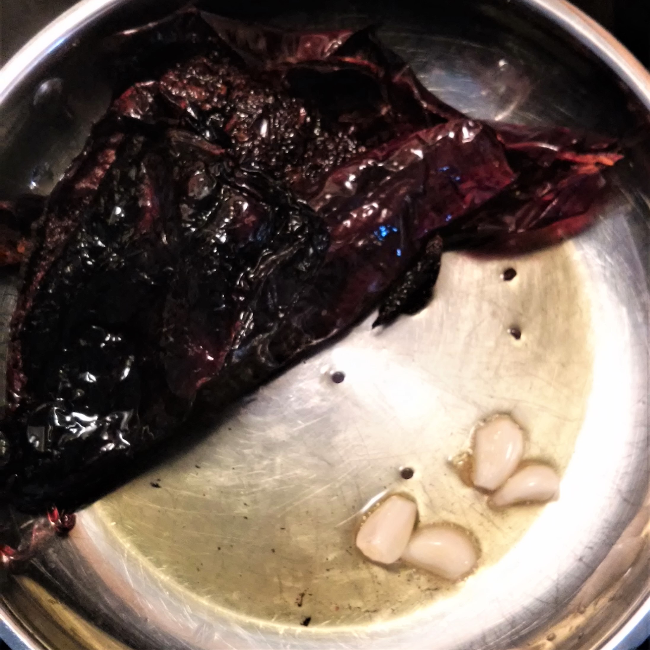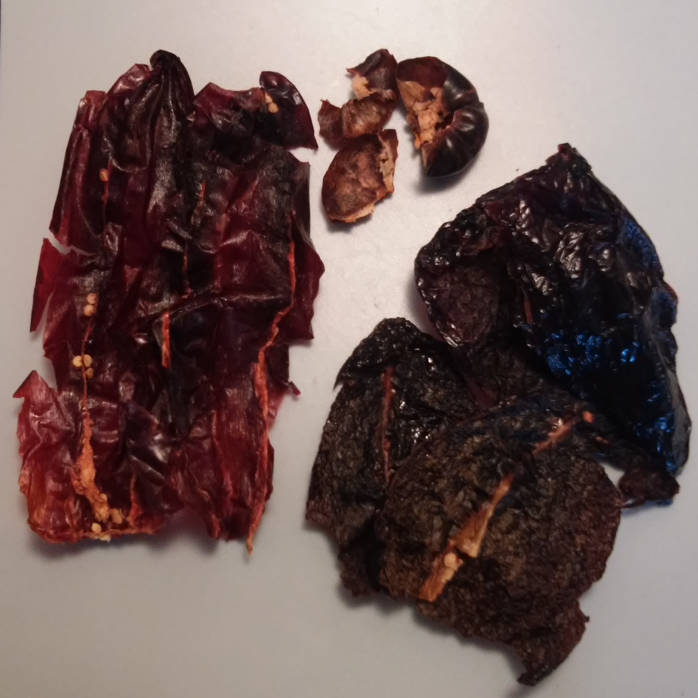 Remove stems and seeds from peppers (from left to right: guajillo, cascabel and ancho):