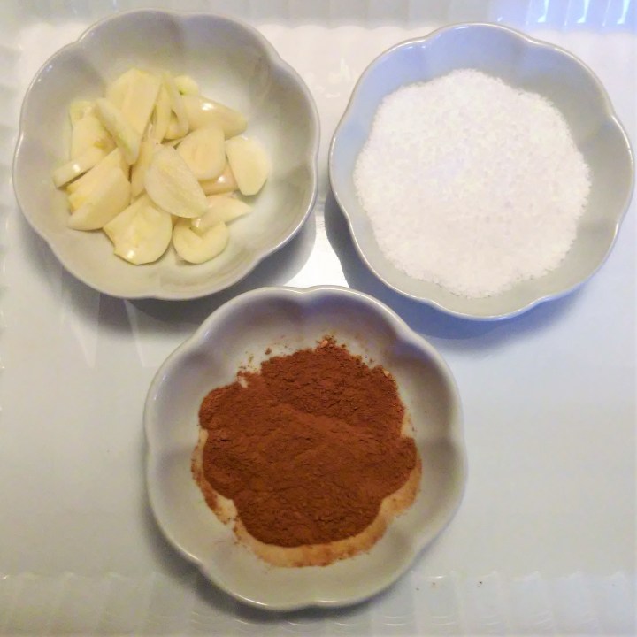 Seasonings: I personally do not like caraway and anise flavours in general, but anise seeds are an essential part of every single recipe of red mole I have seen, so there it is, I included a whole 1/4 tsp, along with cloves and Mexican cinnamon; fresh garlic and salt complete the seasonings (photo below, left). Peel and slice garlic; grind spices with a mortar and pestle, or in an electric grinder; reserve (photo right):