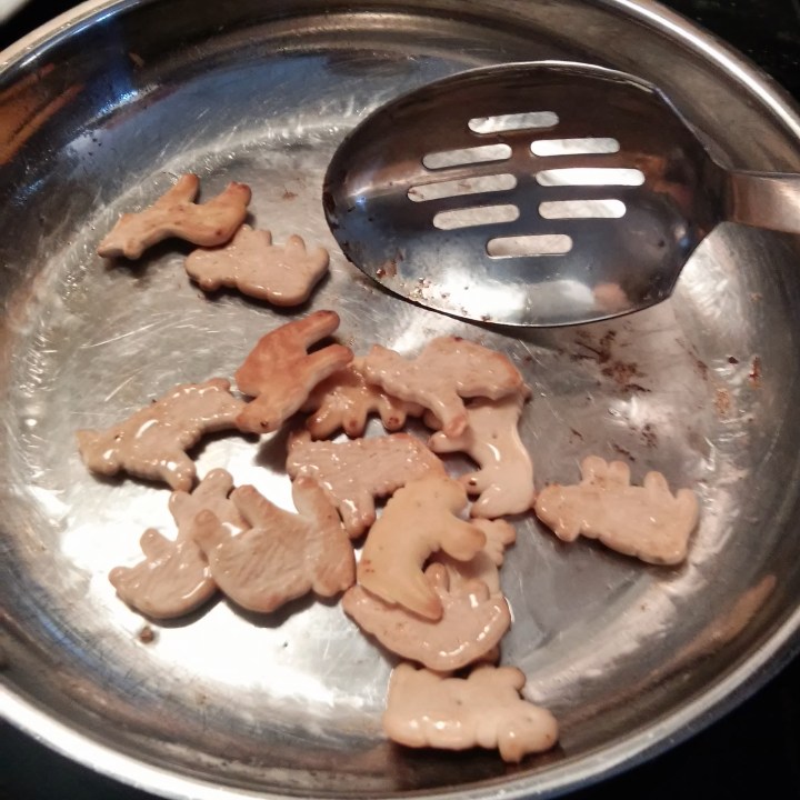 The plantain slices are next; fry for a couple of minutes, then flip to brown both sides and caramelize (photo below, left); continue with the animal crackers (photo right):