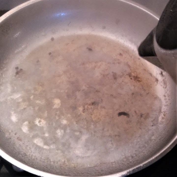 Fry the peppers in the same pan, in batches, being careful to flip frequently to avoid burning, just until they swell and turn crispy (photo below, left); place the fried peppers in a separate bowl. Once finished, deglaze the pan with a little hot water (or broth), scraping all bits from the bottom; pour the rest of the one cup of hot liquid in the pan (photo below, centre), then add to the peppers (photo below, right):