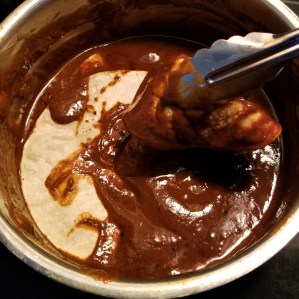 004 dipping tortillas in mole for enchiladas