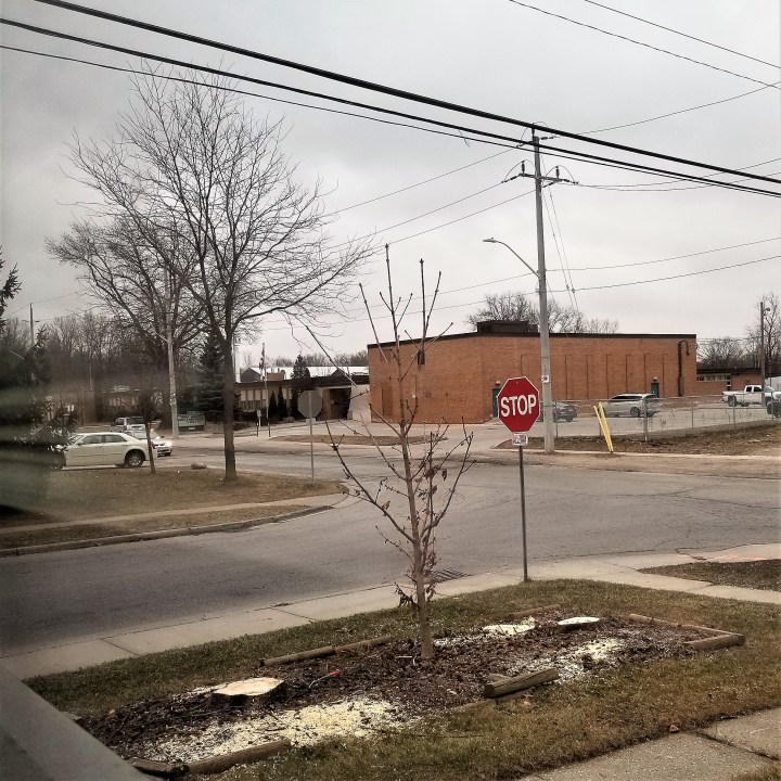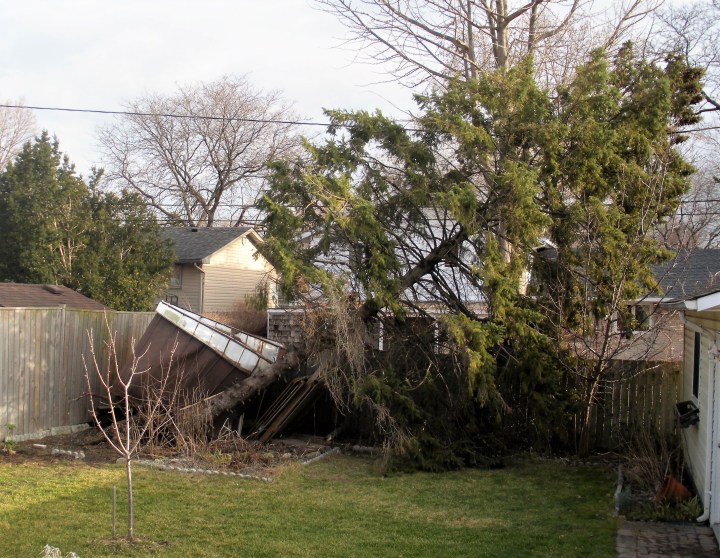 The photo above shows the state of my backyard exactly three years ago, on the morning of February 4, 2016. The day before we had experienced mild temperatures, but winds of up to 43 km/hr (26.7 mph). Our old spruce tree was already struggling, so that day, it just fell over, without much warning. It was pretty scary, considering all those cables hanging right behind my fence, but fortunately, the small trees next to the big evergreen were able to support most of its weight; the shed on the other side of the tree got almost completely destroyed from the roots being lifted out of the earth, but that absorbed a good part of the momentum as well: