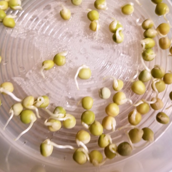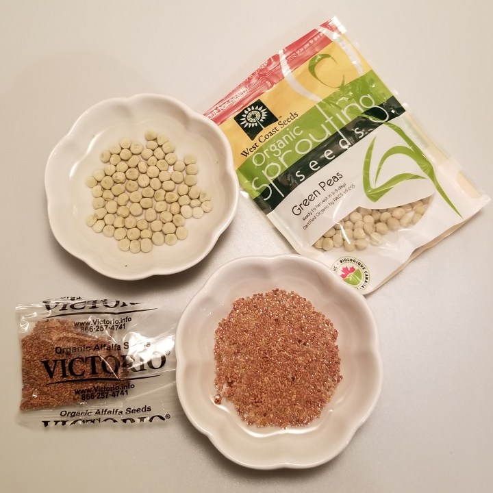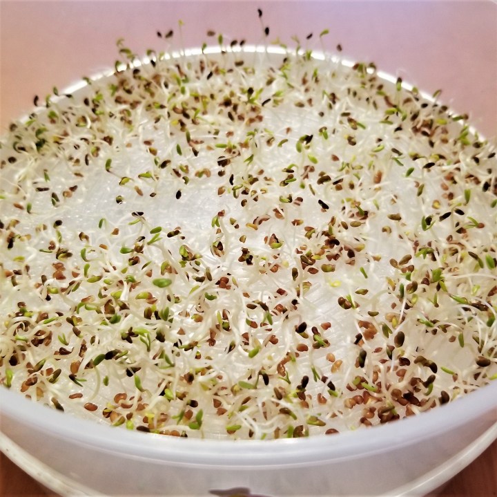 There are many options of sprouters offered in seed company catalogues, home improvement stores, and even Wal-Mart. I am not advertising mine, but I have found it very efficient and convenient. It is a Victorio™ 4-Tray system, in which seeds are spread in each translucent tray; the trays are stacked on top of each other and placed on the collection tray (white tray), and water is poured over the top, 2-3 times a day. The translucent trays have a draining system, and as the water slowly siphons through the trays, the seeds are gently soaked, and germinate (see photo at the top of the post); sprouts are ready after 3-5 days. The process can run with any number of the growing trays, from all four (for a large batch of one type of seed, or four small batches using different types of seed), to a single serving, using one tray. The growing tray design uses water surface tension to keep the correct moisture level in each tray for all stages of the growing process.