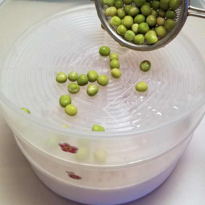 I marked the growing trays with stickers to identify different batches (sometime different types of seeds might look identical). For this post, though, I chose very different looking seed, to illustrate the versatility of the sprouting technique; I used green pea and alfalfa seed. One to two tablespoons of seed are soaked in water at room temperature for 6-8 hours (photo below, left); each batch of seeds is drained in a fine-meshed colander (photo below, centre), rinsed a couple of times with water, and placed in a growing tray (photo below, right):