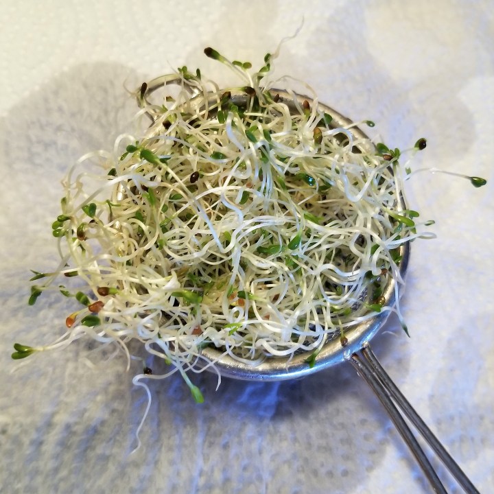 The sprouts are best eaten within two days after harvesting, and must be kept refrigerated, on paper towels, in a container kept partially open. These sprouts are delicious in salads, sandwiches, soups, or as toppings for almost any dish.