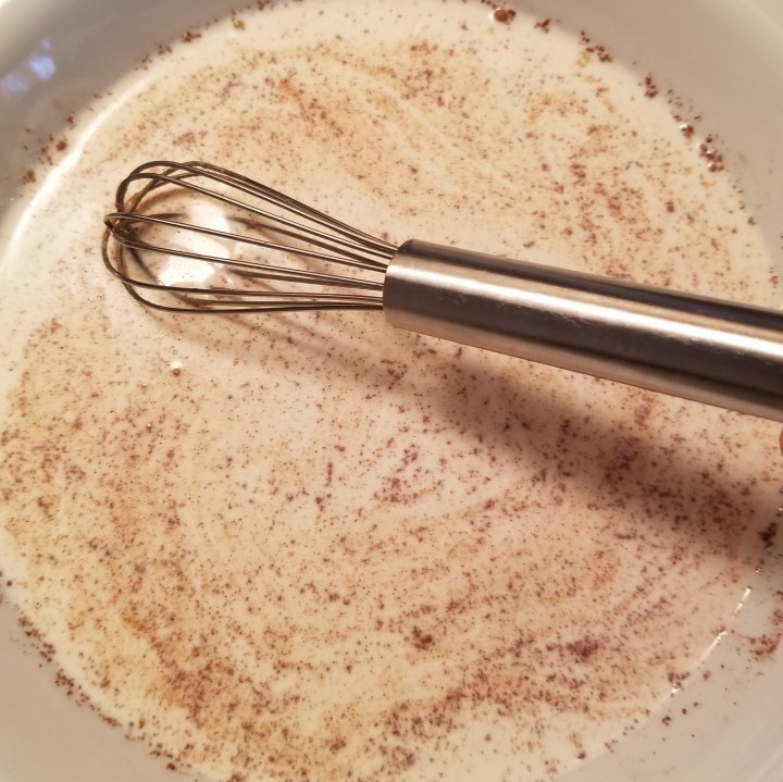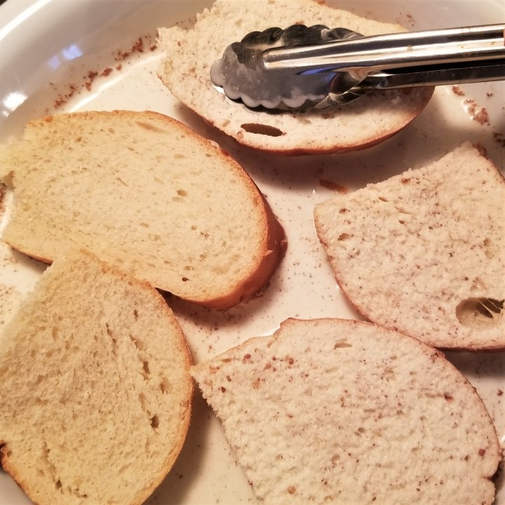In a shallow bowl or pie plate, mix milk, sugar and cinnamon (photo below, left); place bread in the bowl, preferably on a single layer, and allow the slices to soak for one minute, then flip (photo below, right):