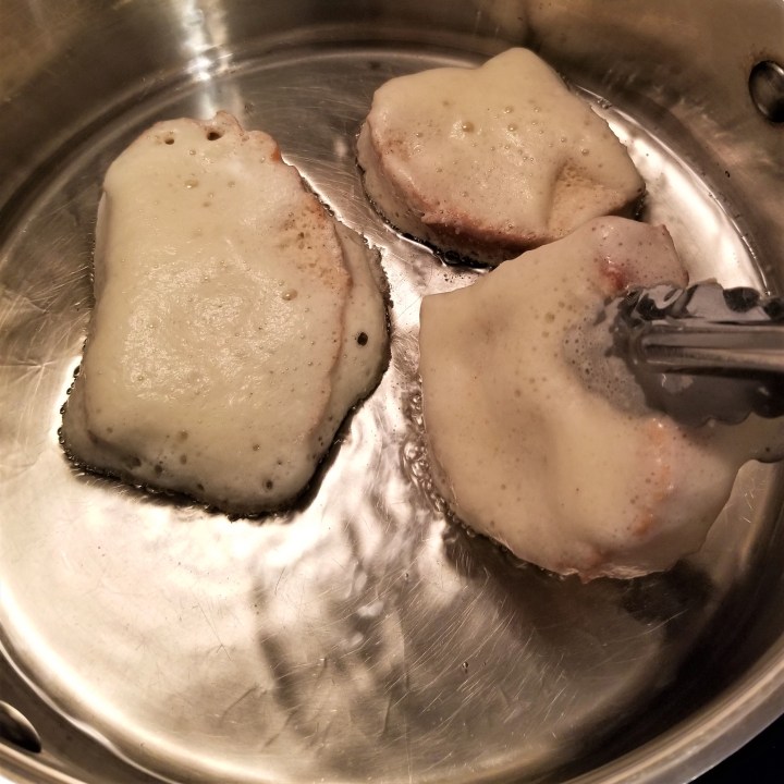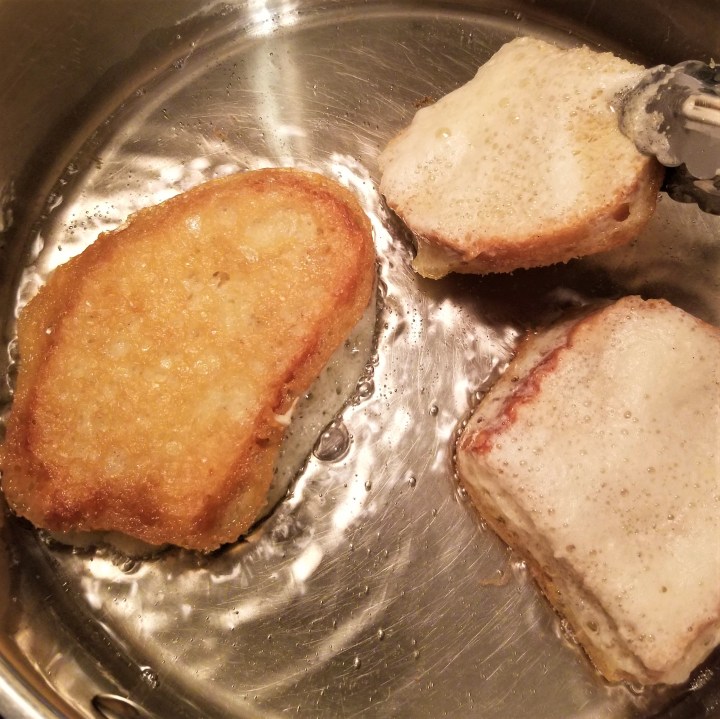 In a large frying pan, heat up the oil at medium/high; once hot, start dipping the slices of bread, one by one, in the egg batter, handling carefully as they have become fragile from soaking in the milk (photo below, left), then transfer to the pan to fry (photo below, right):