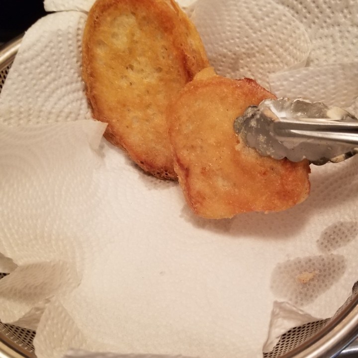 Flip the slices once they are golden brown, allowing to cook and brown on the other side (photo below, left); remove from the oil into a colander fitted with paper towels (photo below, right):