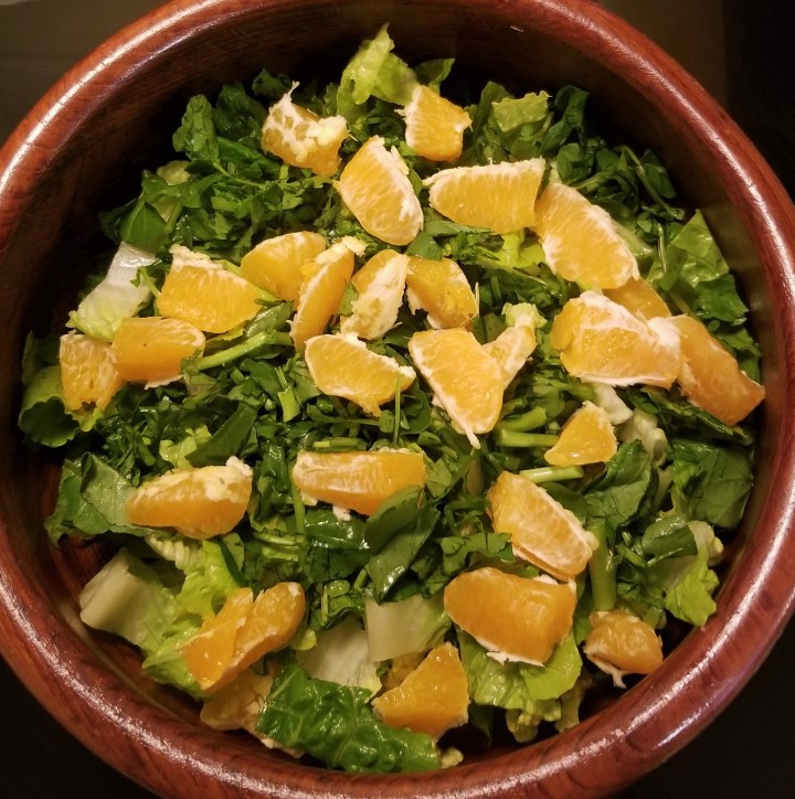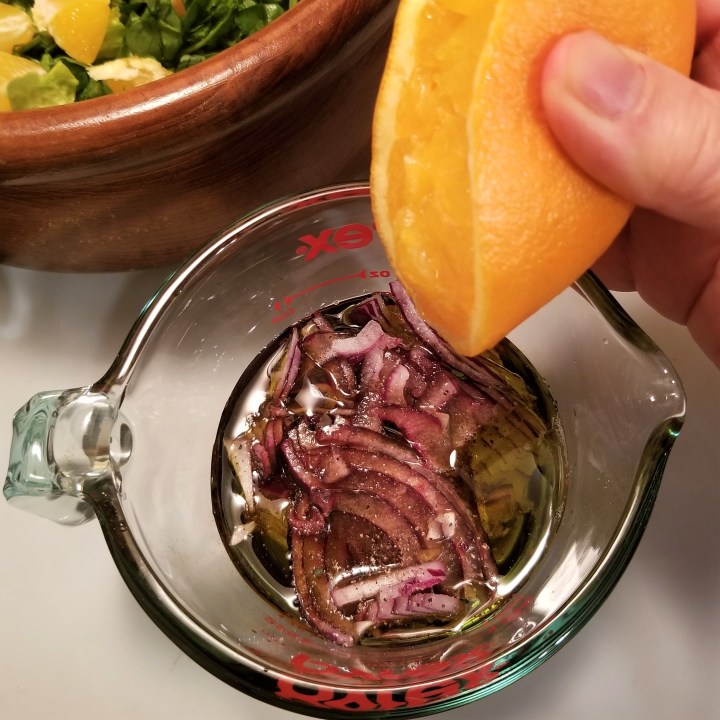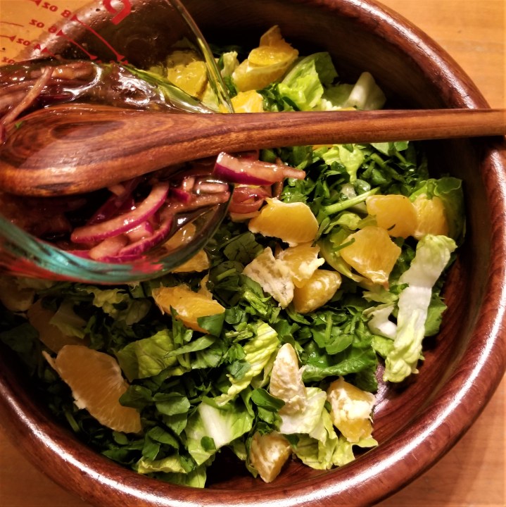Mix lettuce and watercress in a large bowl, then place orange pieces on top (photo below, left). In a separate container, mix oil, vinegar, salt and pepper; incorporate onions, then squeeze juice from one orange (photo below, right):
