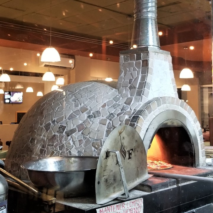 The kitchen at Maggiore restaurant uses a stone oven (photo below, left), and our pizza “La Sinaloense” (Sinaloa style) came nicely charred, topped with refried beans like in my recipe, but had local chilorio and ham instead of chorizo, and two cheeses (photo below, right):