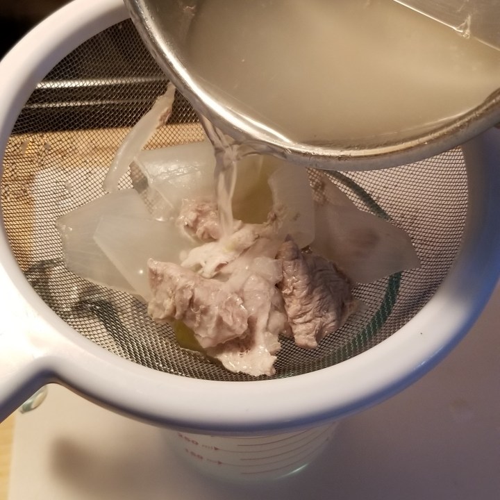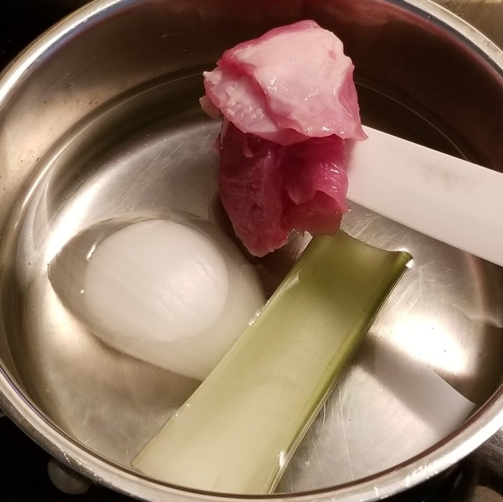Meanwhile, prepare broth: place reserved trimmed fat and meat in a small pot with water, celery and onion (photo below, left); bring to a boil over high heat, then reduce to a simmer and cook, covered, until meat is tender (approximately 45 minutes.) Strain through a mesh (photo below, right):