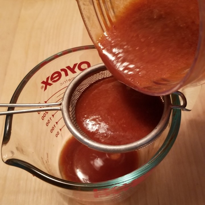 Reserve those strips for later. Soak the rest of the pieces (about half) in the freshly boiled water, and allow to soak until it cools down. Process soaked peppers and water in the blender, along with the reserved onions (from the broth), salt, nutmeg and white pepper until smooth, then pour onto a cup or bowl through a strainer (photo below, left). Heat up one tablespoon of the oil in a small saucepan over medium heat; when the oil is hot, pour the strained sauce and stir, cooking until it reaches boiling point (photo below, right):