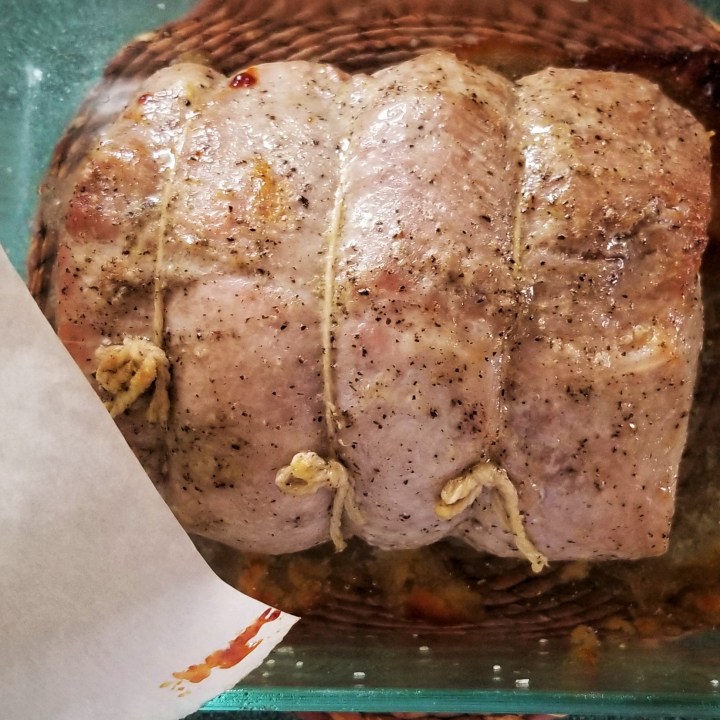 Return uncovered roast to the oven, and allow to cook until the outside is slightly crispy, and the inside registers at least 155 ºF (65.6 ºC) for well done (the only way I cook pork); it took about 15 more minutes for this roast: