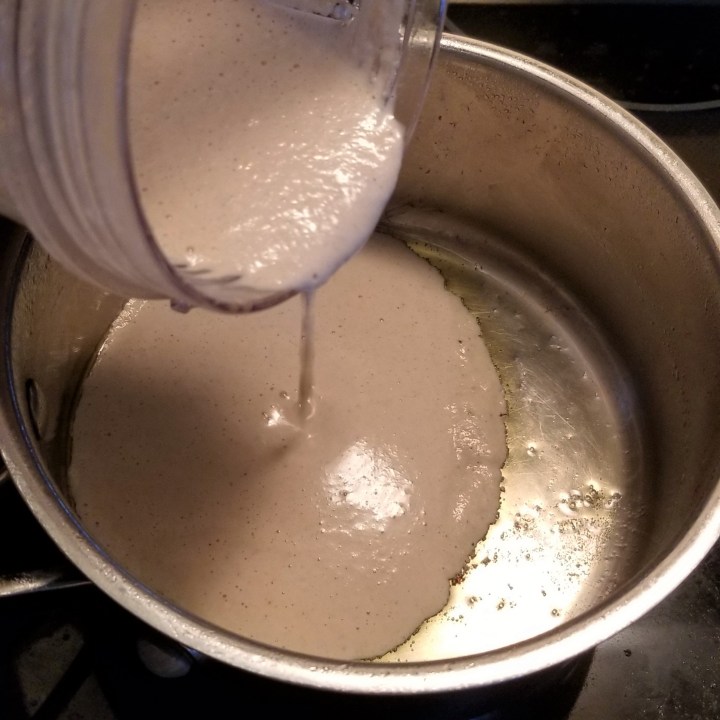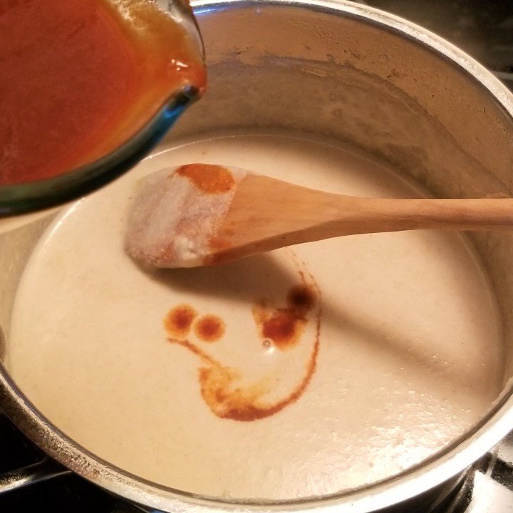 Meanwhile, finish sauce: toast sesame seeds in a dry pan over medium heat, stirring constantly; when a few seeds start to pop, remove from heat and reserve. To blanch almonds, drop in a pot of boiling water for about 30 seconds; scoop with a slotted spoon and drop in cold water; drain and peel almonds (the brown skin should come off easily). Chop blanched almonds coarsely and toast just for a few seconds in the dry pan; remove from heat. Add toasted sesame and almonds to a blender jar, add one cup of the reserved (and cool) broth, and process, first pulsing a few times, then blending until smooth. In a saucepan, warm up the second tablespoon of oil over medium heat, then pour the white sauce in (photo below, left); warm up, stirring constantly, and just when it starts bubbling, reduce heat to very low heat, stirring gently, to avoid separation of the oil, and achieve a terse textured sauce. Continue stirring, adding and incorporating a few drops of the reserved red sauce at a time, until desired shade of blushed sauce is reached (photo below, right):