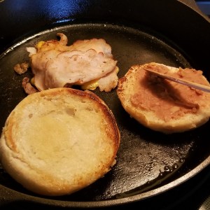003 place cheese and ham on mpork roast, flip buns spread refried beans