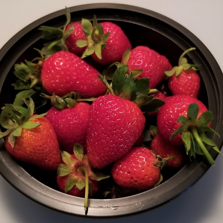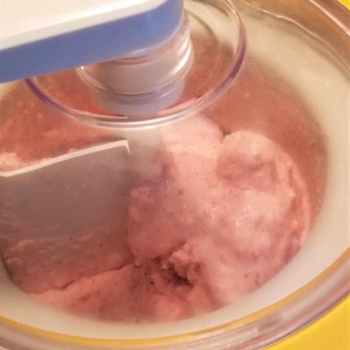 I recently scored a vintage manual Donvier™ ice cream maker at my church’s yard sale; it did not have instructions, but the previous owner showed me how to use it (thanks, Cora!) She also said it was easy, and the ice cream was ready in about twenty minutes. Now, I always assumed you had to crank the handle continuously, but the best part is that you only have to turn it clockwise 3 times, every 2-3 minutes; that is only about 30 turns total! I also watched an old video with Martha Stewart, where she demonstrates the manual Donvier™ and an electric ice cream maker; she mentions that the manual is faster than the electric, and gently admonishes those who “turn the handle too much, because it actually slows the process.” Finally, I found the manual on line, which is short but very well written, and includes a few recipes. For this post, I adapted their blueberry ice cream recipe; it is simple and has only four ingredients, just what I wanted, to highlight my freshly picked strawberries.