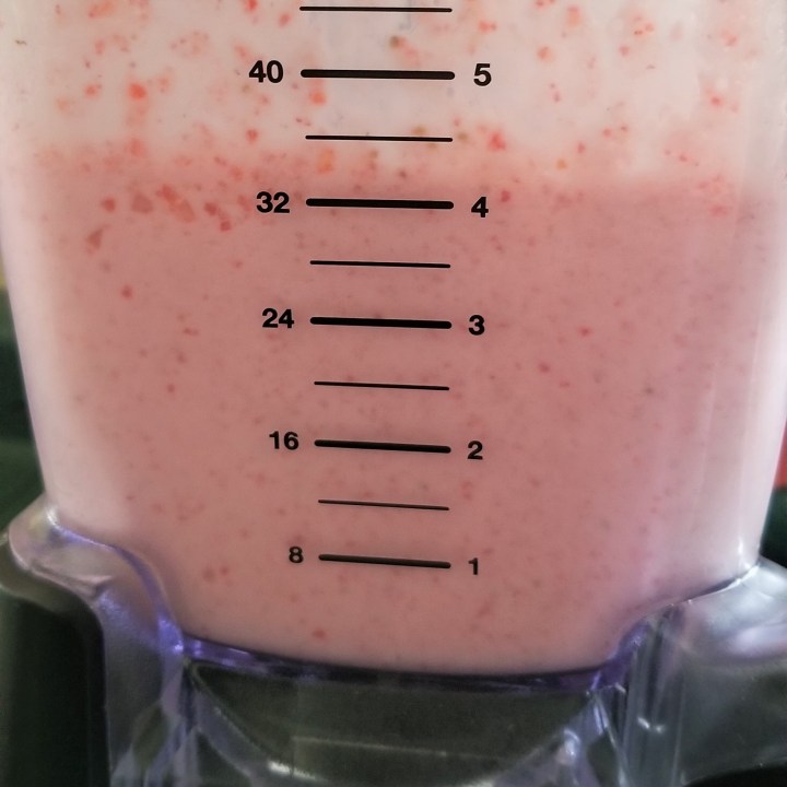 Wash and dry strawberries; remove hulls and slice in half; keep refrigerated until prep time. Place in a blender jar with the rest of the ingredients (photo below, left); process until smooth (photo below, right):