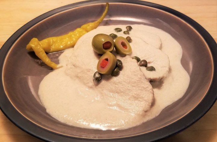 While the sauce is simmering, if needed, warm up meat in the microwave oven (or in a pan, covered, over low heat, or if using fish, grill at this point, right before serving.) Place slices of roast on a serving plate (or slices of turkey breast, or pieces of chicken, or fish filet). Cover with a very generous portion of white pipian sauce, and garnish with a pepper and a few olives and capers: