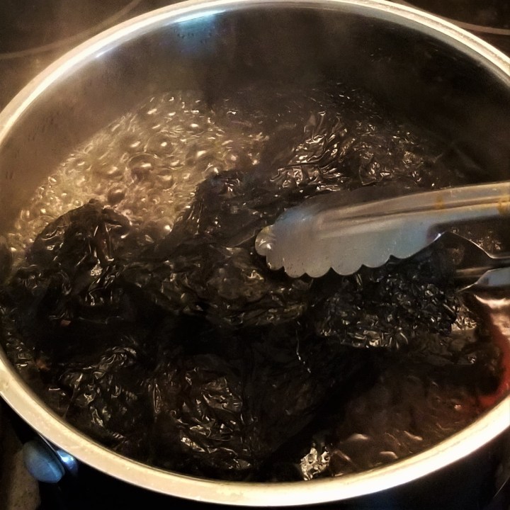 Bring water to boil in a sauce pan over high heat. Meanwhile, roast cleaned peppers on a dry (no oil) skillet, flipping and turning frequently so they do not burn, just until they start to turn a lighter tone, and swell slightly (photo below, left); remove promptly from heat, and add to the boiling water (photo below, right):