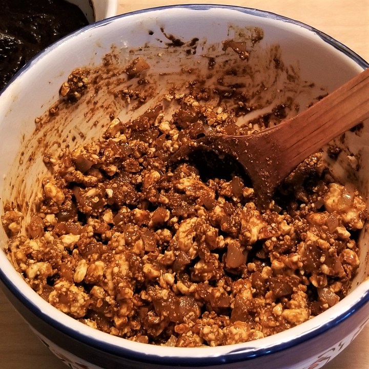 Mix all together; again, to taste, add more paste, one tablespoon at a time, to obtain a flavourful mix for the filling. In the photos below, my filling after adding one tablespoon (left) and two tablespoons, total (right):