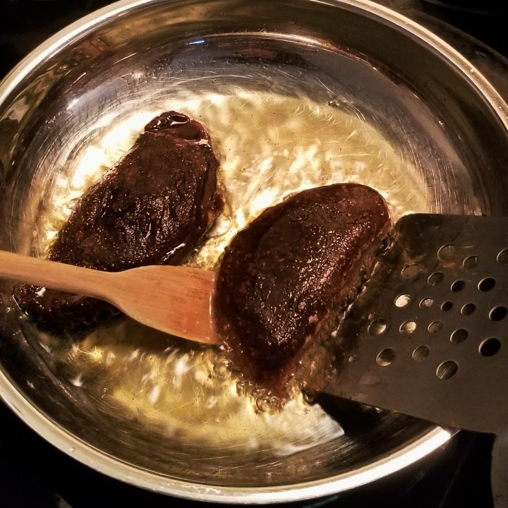 Once all the half circles are formed, grill on the dry skillet, about one minute per side; flip when the dough is not sticking to the skillet any more. Do this step in batches to allow for plenty of room to flip the half circles carefully (photo below, left) . Wipe any onion residue from the small frying pan, and add enough oil to cover the bottom, and preferably have about 1/4 inch depth (I use the smallest pan I have, to use as little oil as possible). Place over medium-high heat until the oil ripples but it is not smoking, then reduce heat to medium; fry two patties at a time, just for a few seconds per side, flipping with two spatulas (photo below, right):