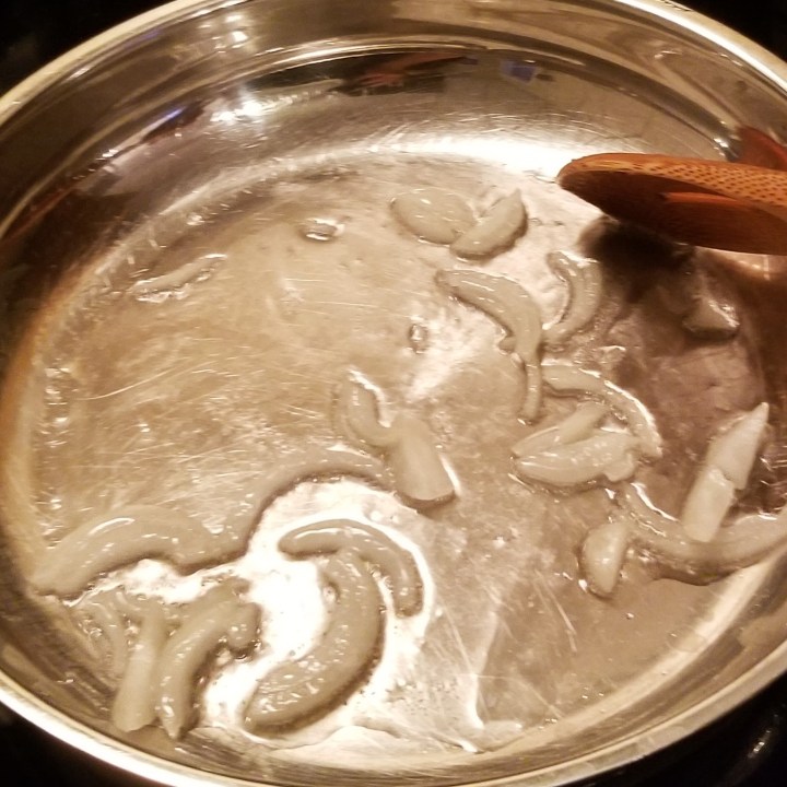 For white sauce: While red sauce is simmering, warm up oil in a pan and sauté onions until translucent (photo below, left); add pepper strips and continue cooking for another minute.  Add jocoque (or yogurt/cream mix, photo below, right):