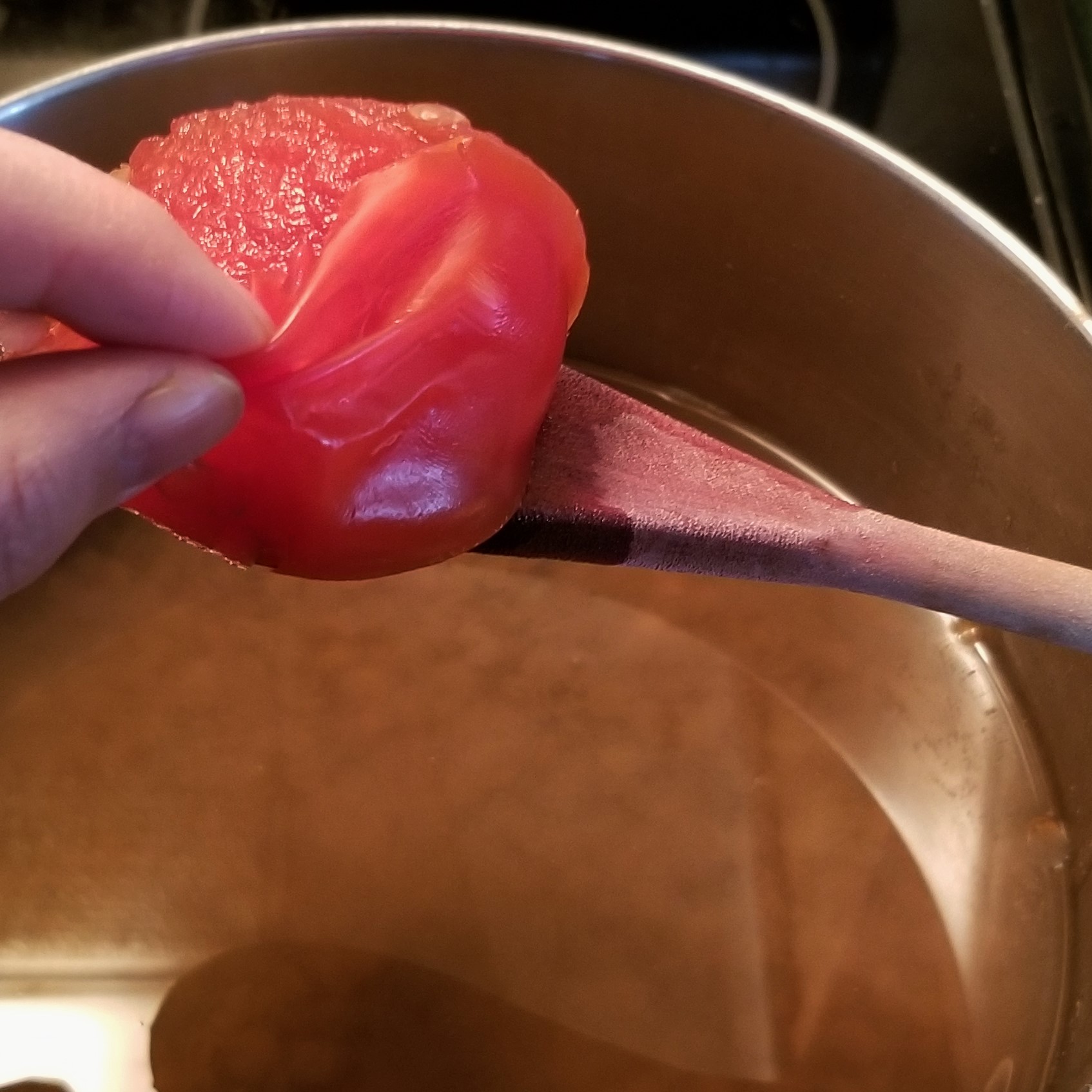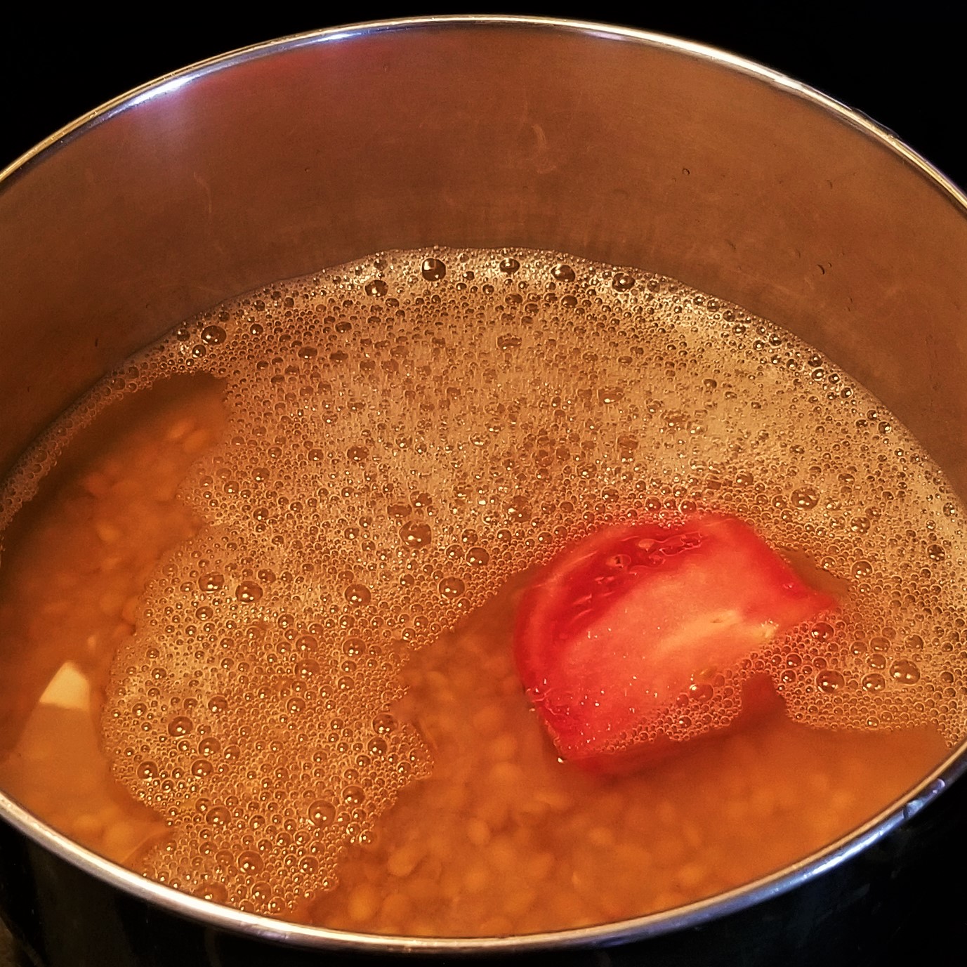 Place lentils, water and tomato in a pot over high heat, and bring to boil (photo below, left); reduce to medium heat, partially cover pot and cook for about twenty minutes, until lentils are tender. Remove from heat and allow to cool for at least one hour. Remove tomato from the pot, and pull and discard skin (photo below, right):