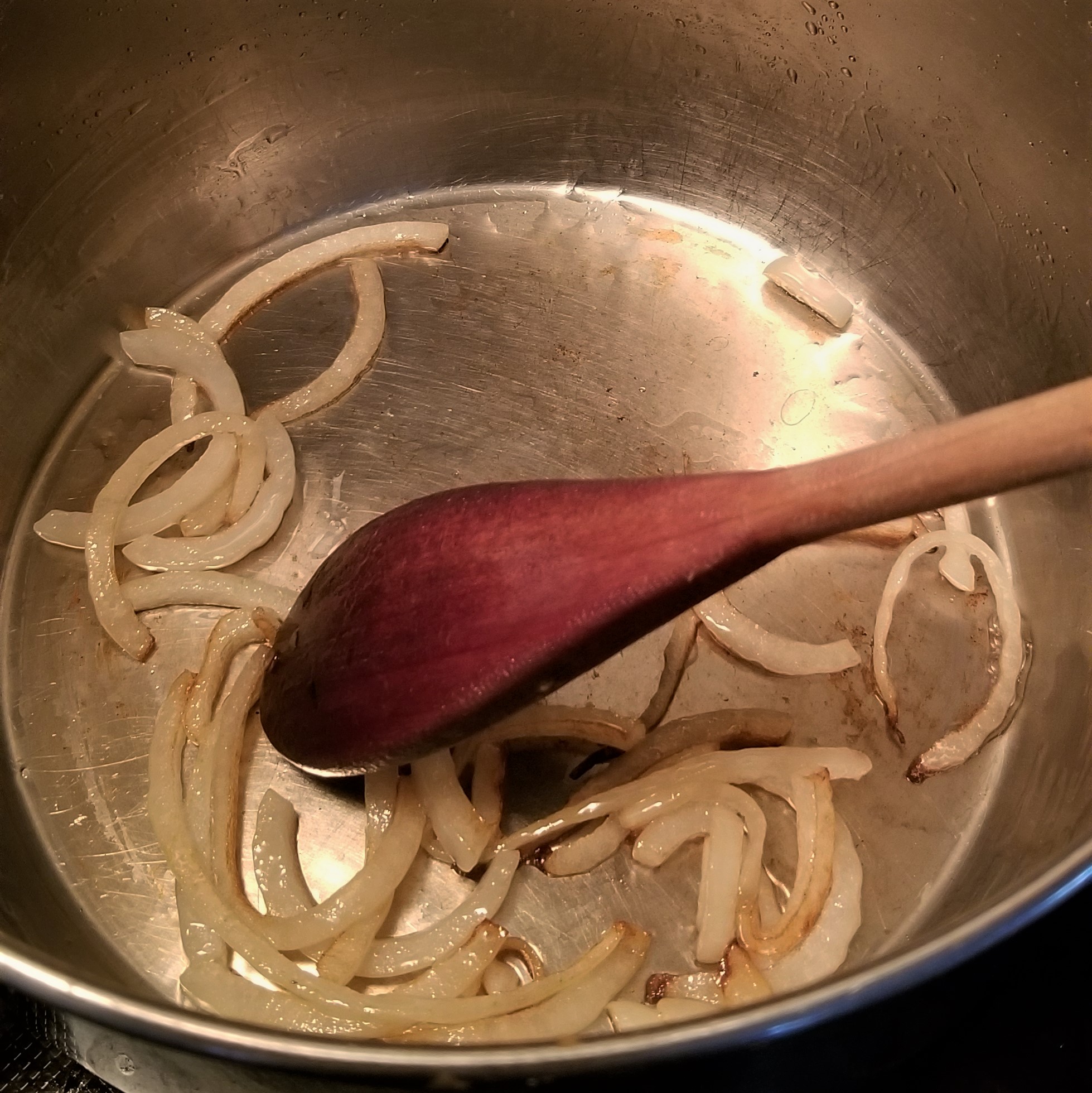 Measure and reserve half a cup of the cooking liquid (photo below, left); transfer the rest of the liquid, lentils, and peeled tomato to a blender jar, and reserve. Add oil to the empty pot, and warm up over medium heat; add onions and sauté until translucent and slightly browned (photo below, right):