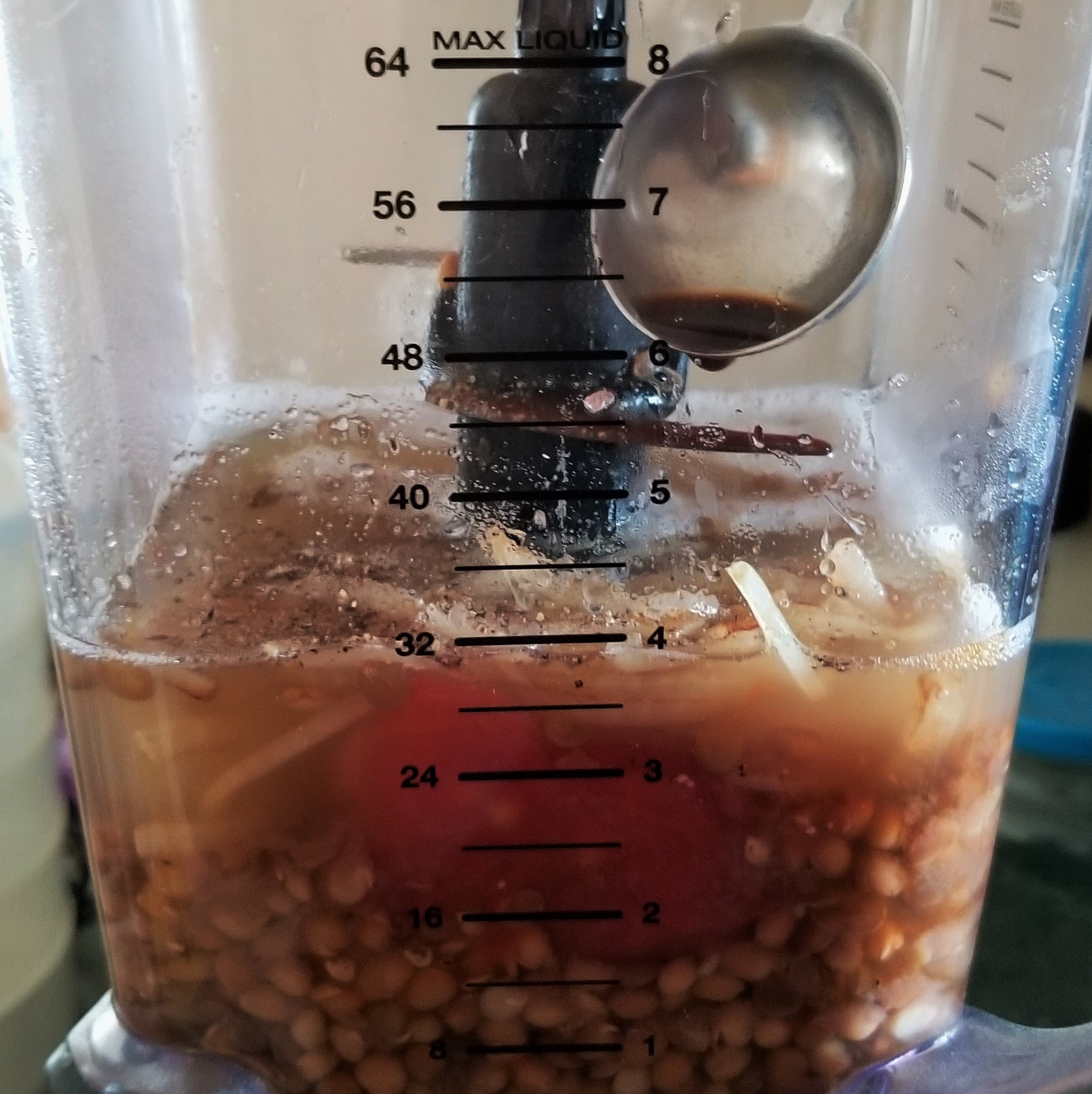 Remove from heat, and reserve pot, adding onions to the blender jar, along with the salt, black pepper and Worcestershire sauce (photo below, left); blend thoroughly, for about one minute, until very smooth (photo below, right):
