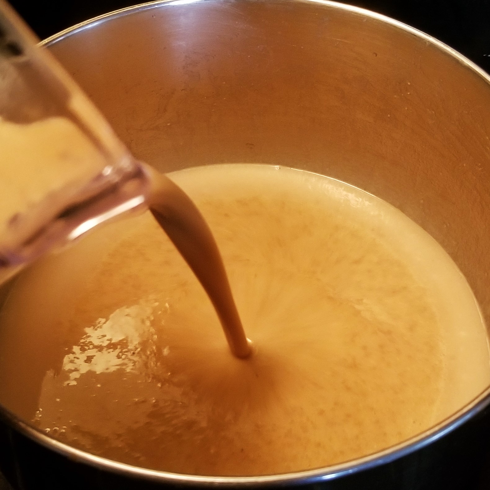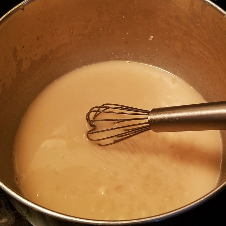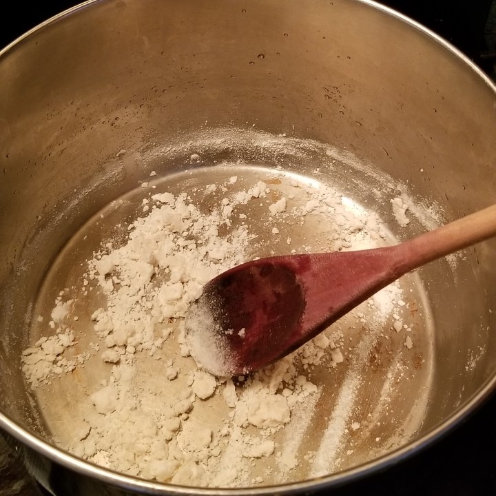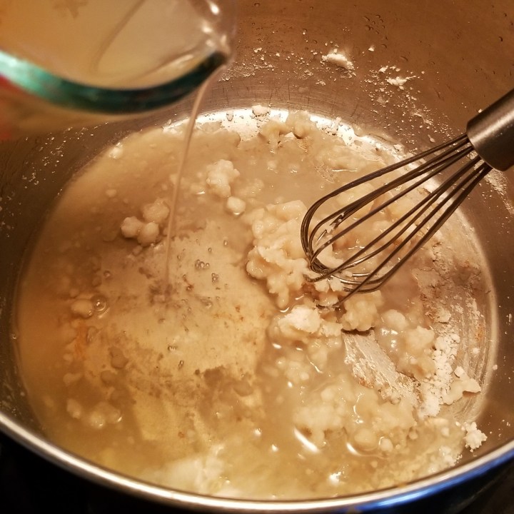 Back to the stove, reheat oil left in the pot over medium heat, add flour and stir, breaking up clumps (photo below, left). Add reserved half cup of cooking liquid, stirring constantly with a beater (photo below, centre); continue cooking and stirring until a smooth and slightly thickened sauce is obtained (photo below, right):
