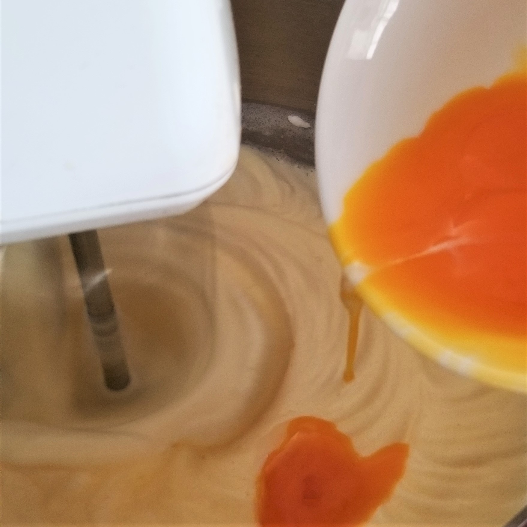 Beat egg whites until white and firm (photo below, left); continue mixing, while adding the egg yolks, one at a time (photo below, right):