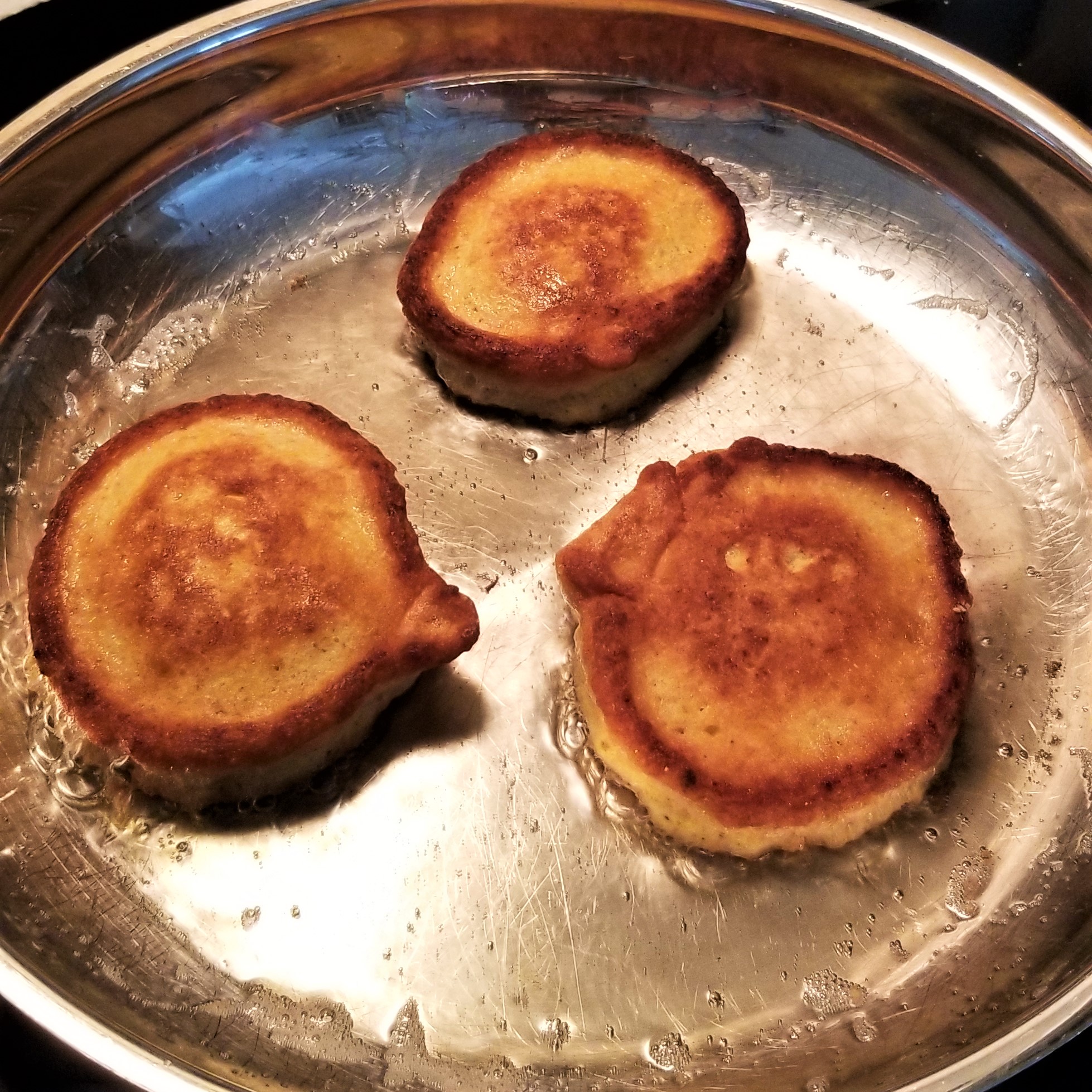 Warm up oil (enough to cover the bottom of a frying pan) over medium heat; scoop batter onto the frying pan, about two tablespoons at a time (photo below, left); allow to cook until golden brown, then flip to brown the other side (photo below, right):