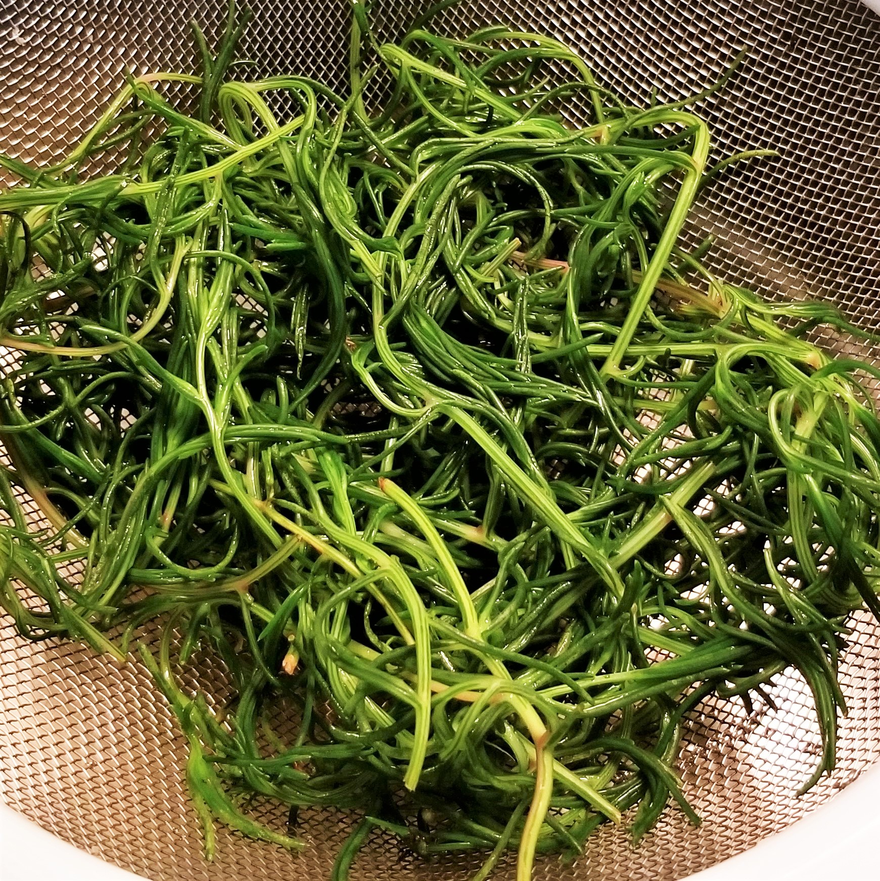 To cook the pot herbs: Salsola and romeritos are pot herbs from the Amaranthaceae family; they both grow in salty soils. They look similar when raw, as seen in the photos below; the one on the left is salsola (also known as agretti) from my backyard garden, and on the right, romeritos from a batch in Mexico: