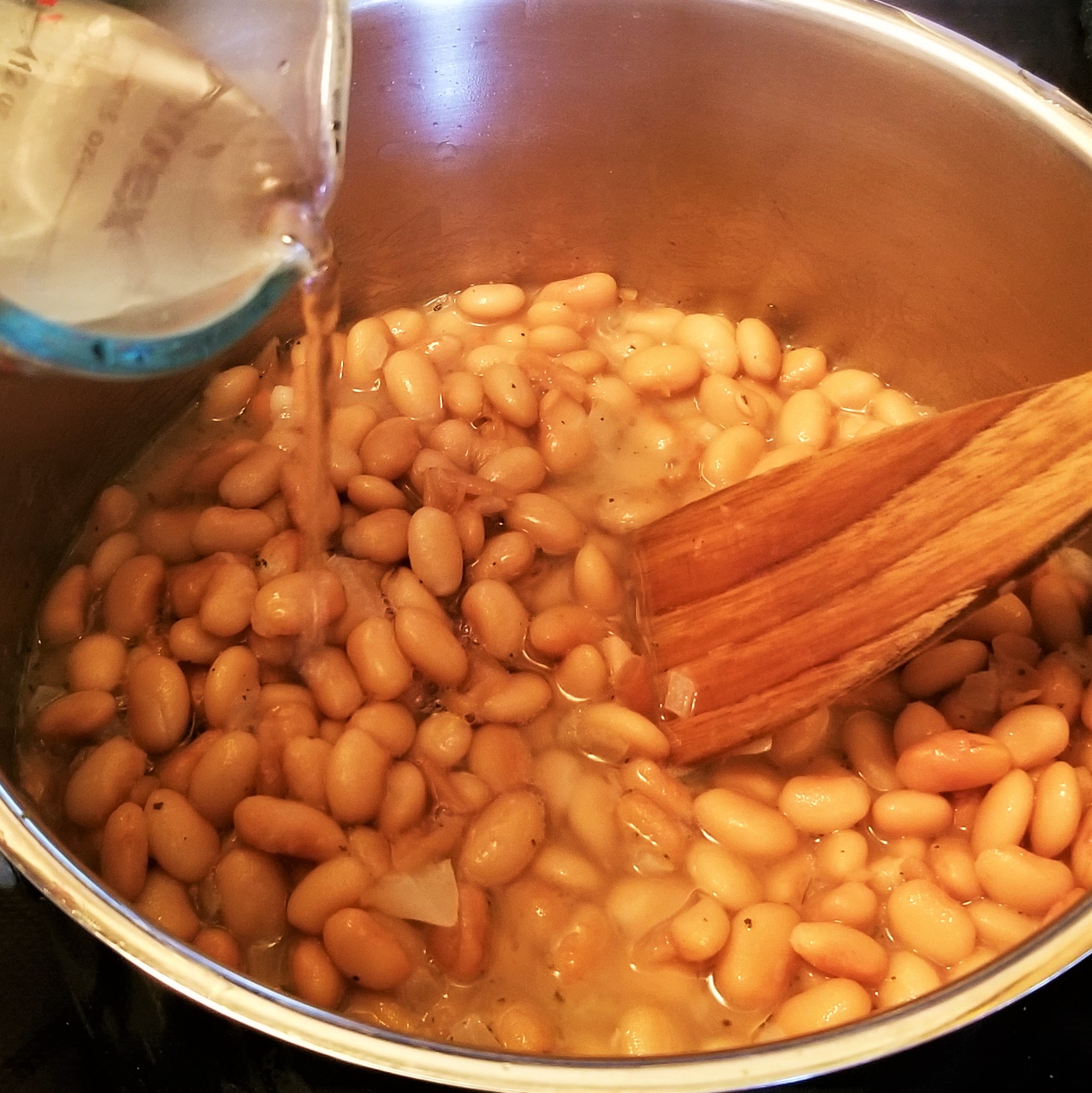 Warm up oil in a pot over medium heat; add onion and sauté until translucent, then add the herbs (photo below, left); continue cooking and stirring for about half a minute, then incorporate beans and water (photo below, right):