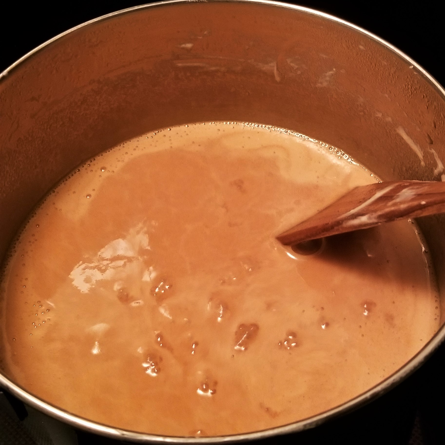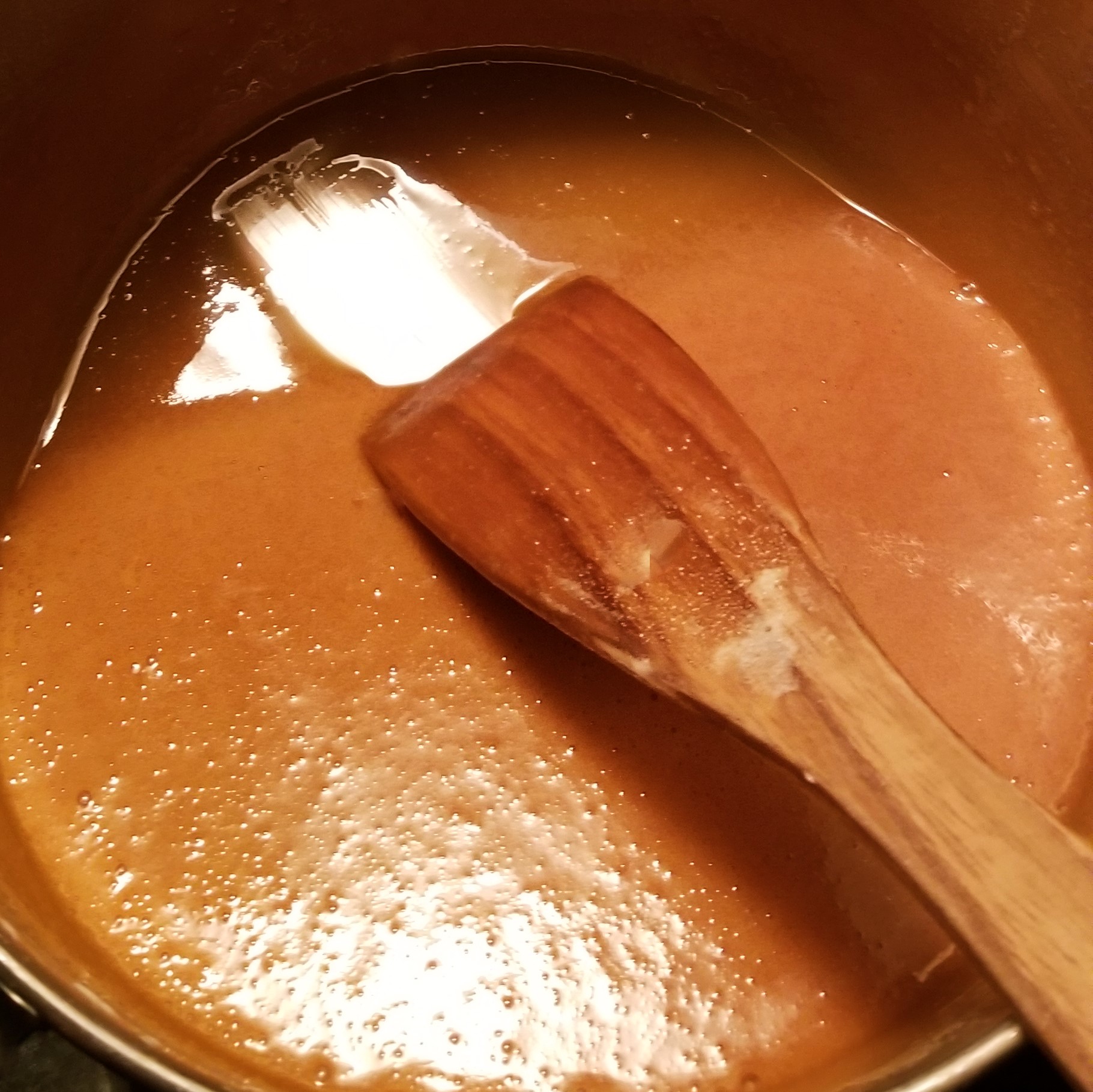 After about half an hour, the mix should look noticeably darker, and thicker (photo below, left). Do not touch or try to taste the mix, it will be extremely hot. Stir more frequently from this point on, until the bottom of the pan remains visible for a few seconds after scraping with the spatula (photo below, right):