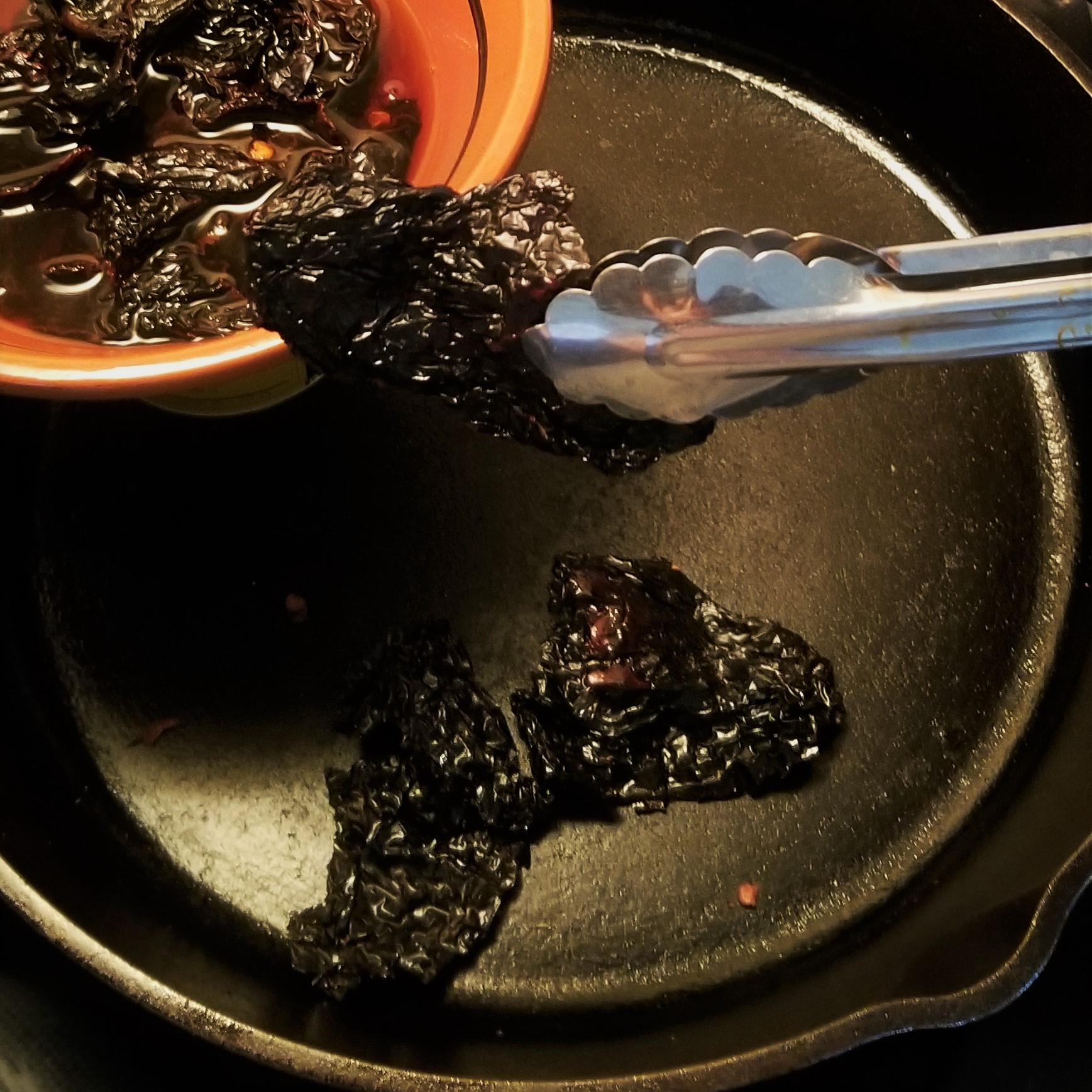 Meanwhile, prepare sauce: lightly toast almonds in a dry skillet (no oil), stirring frequently, for just one to two minutes, before they start to brown (photo below, left); remove promptly from skillet, and reserve. In the same skillet, toast the ancho peppers being careful not to burn them, turning frequently and transferring to a bowl with the hot water (to keep it vegetarian, or broth, if using chicken), as shown in the photo below, right:
